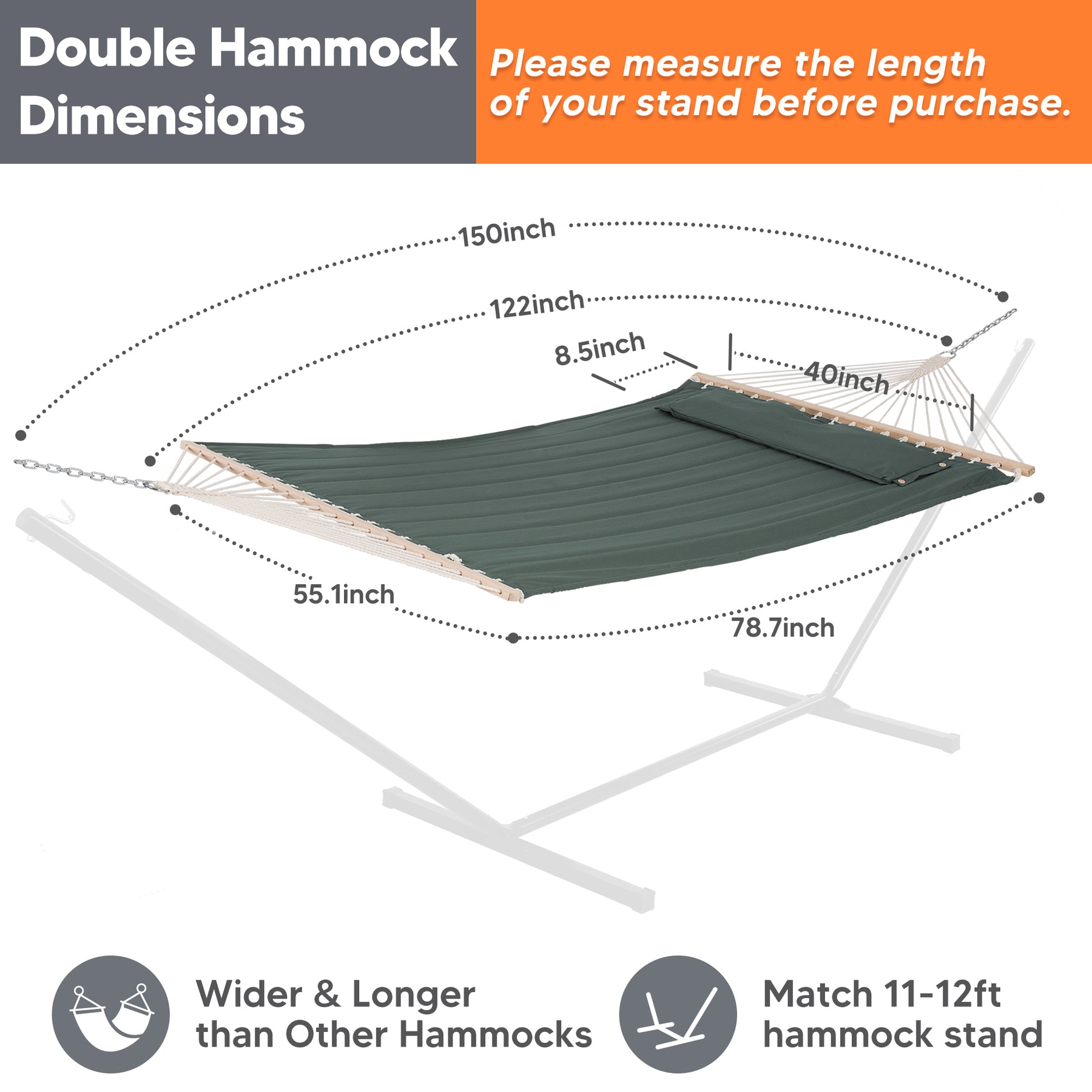 • Bed Material: 100% Polyester fabric with poly fiber filling • Pillow Material: Polyester with polyethylene stuffing • Package Dimensions: 56" X 6.7" X 6.5" (L X W X H) • Hammock Bed Size: 78.7" X 55.1" (L X W) • Ring to Ring: 122" • Spreader Bar: 55" hardwood • Item Weight: 10.68 lbs • Weight Capacity: 475 lbs • Suitable for 10-12ft stand (Stand not included)