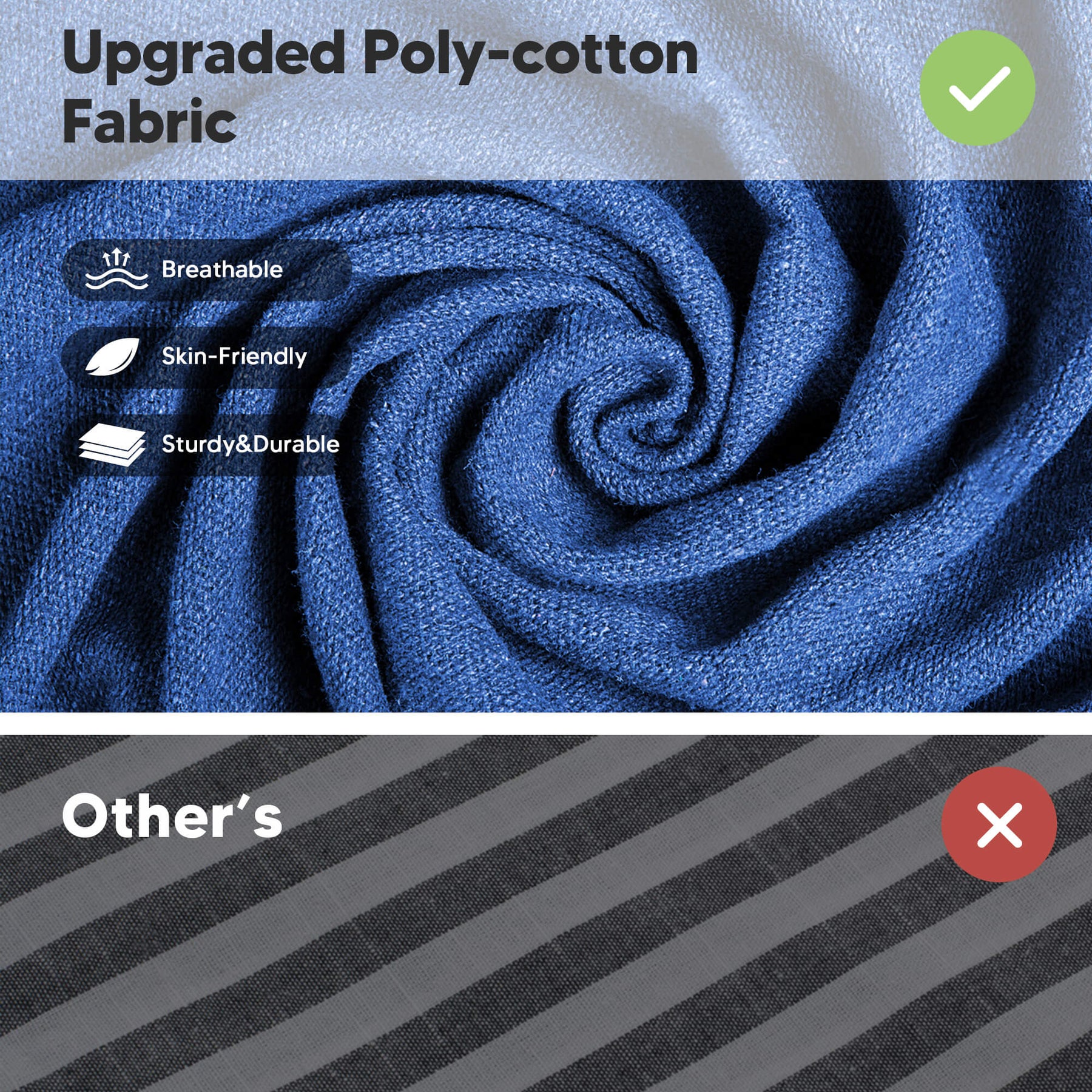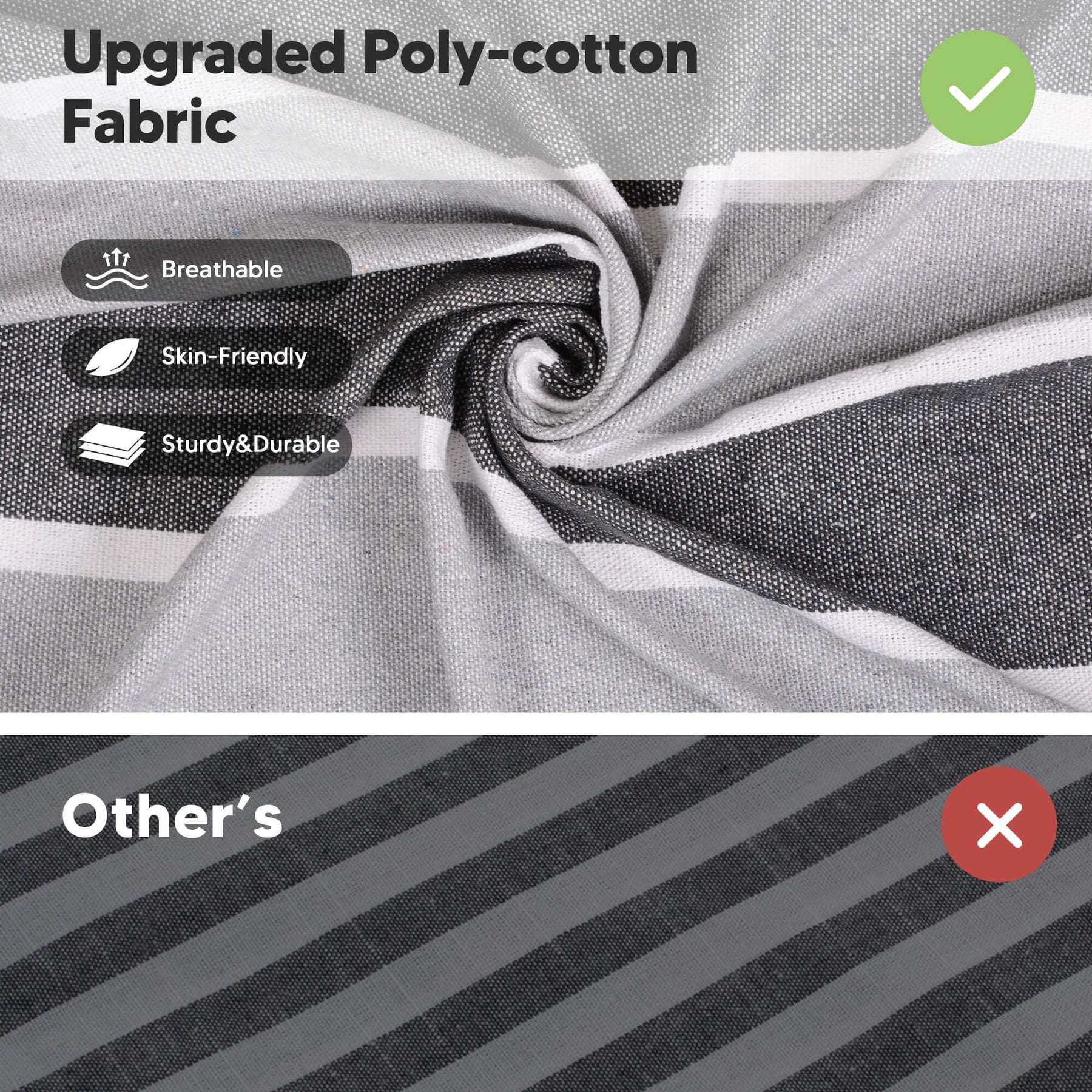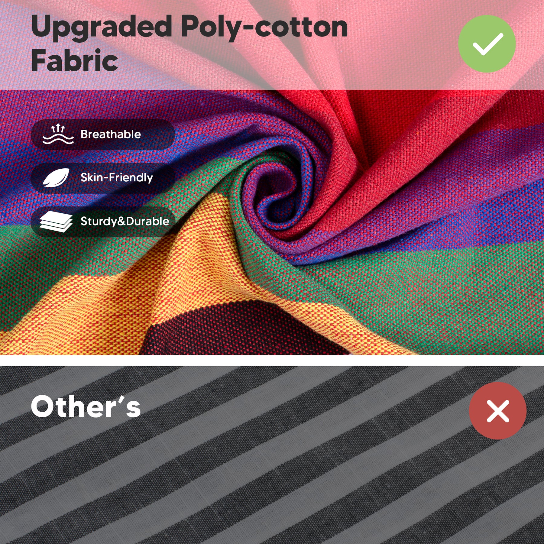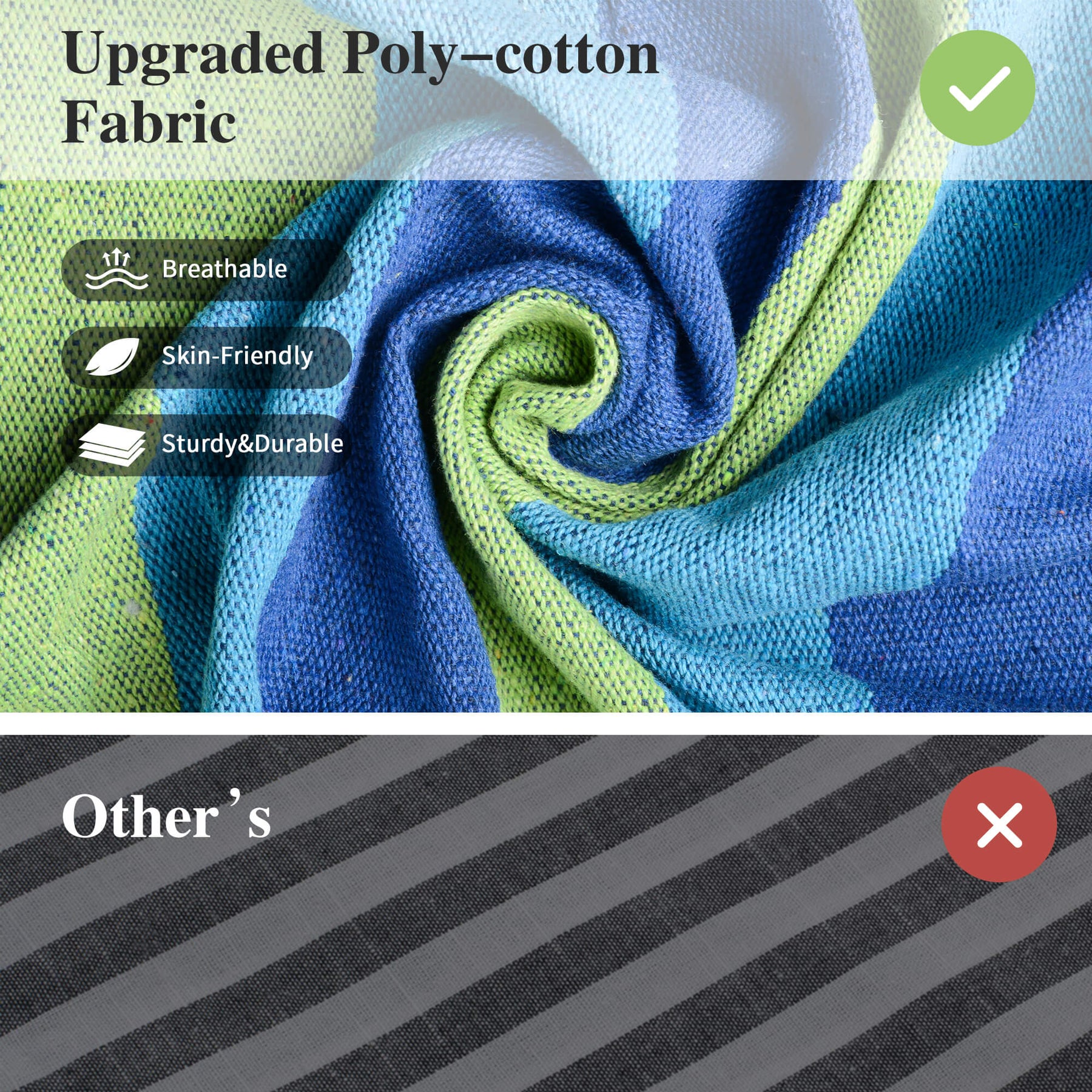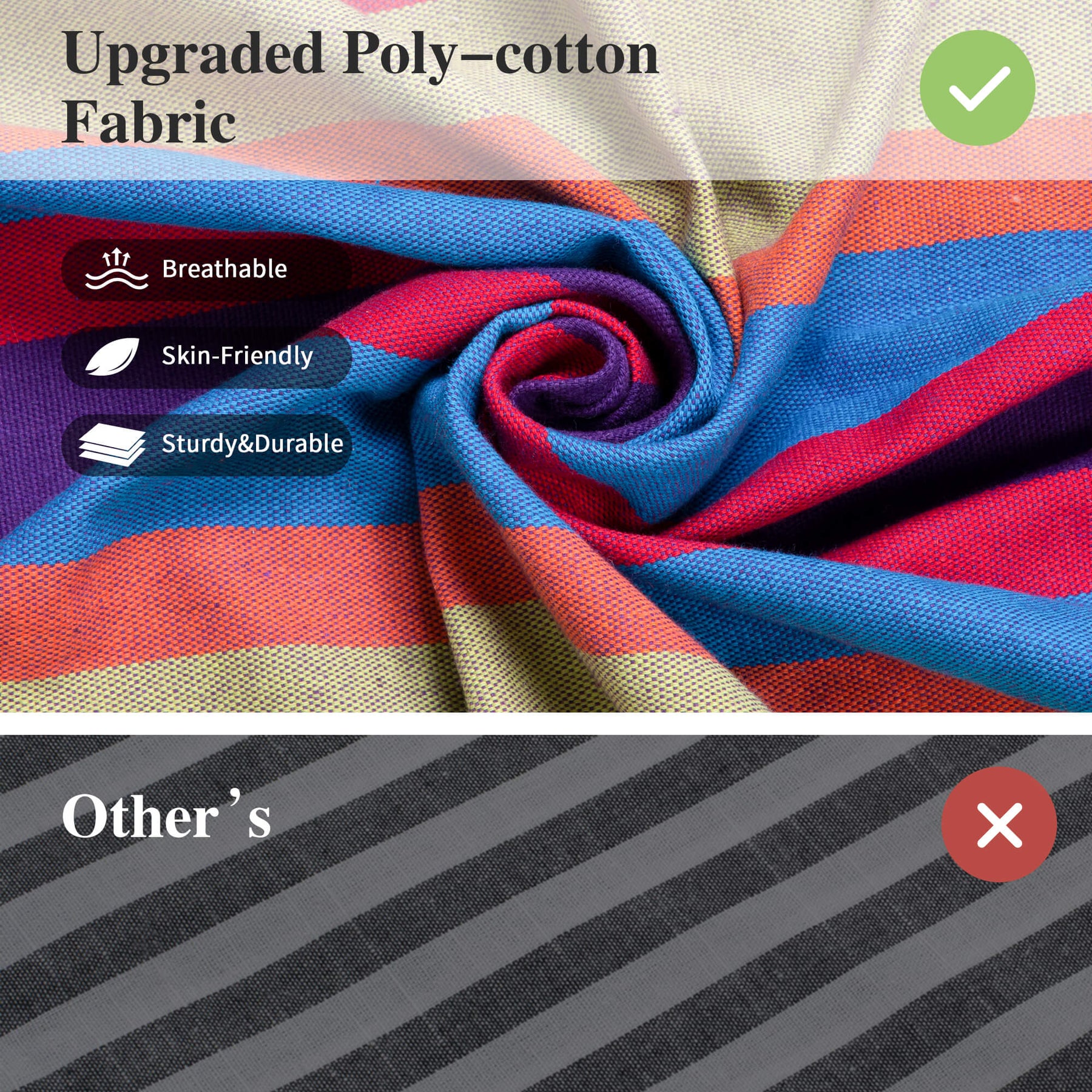 • Upgraded Eco-Friendly Fabric: Thicker poly-cotton fabric (lint-free, odorless, pilling-resistant, fade-proof, skin-friendly, breathable). The camping hammock has a cocoon-style design that provides secure comfort.