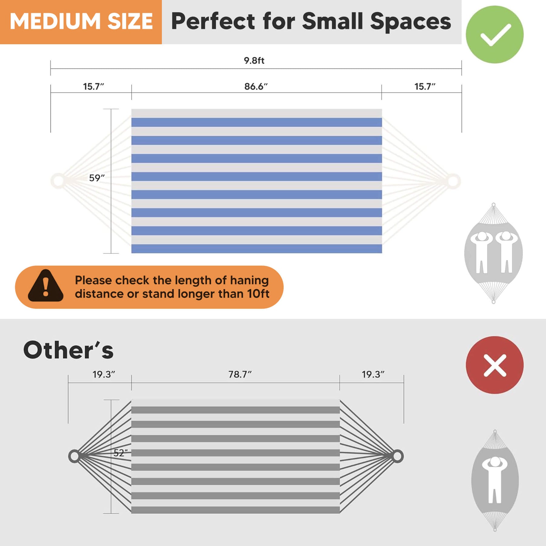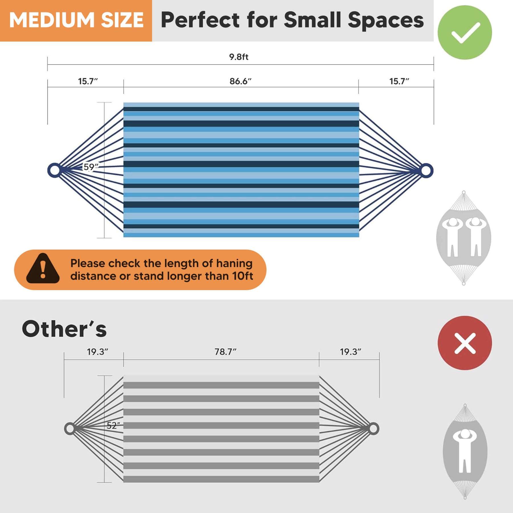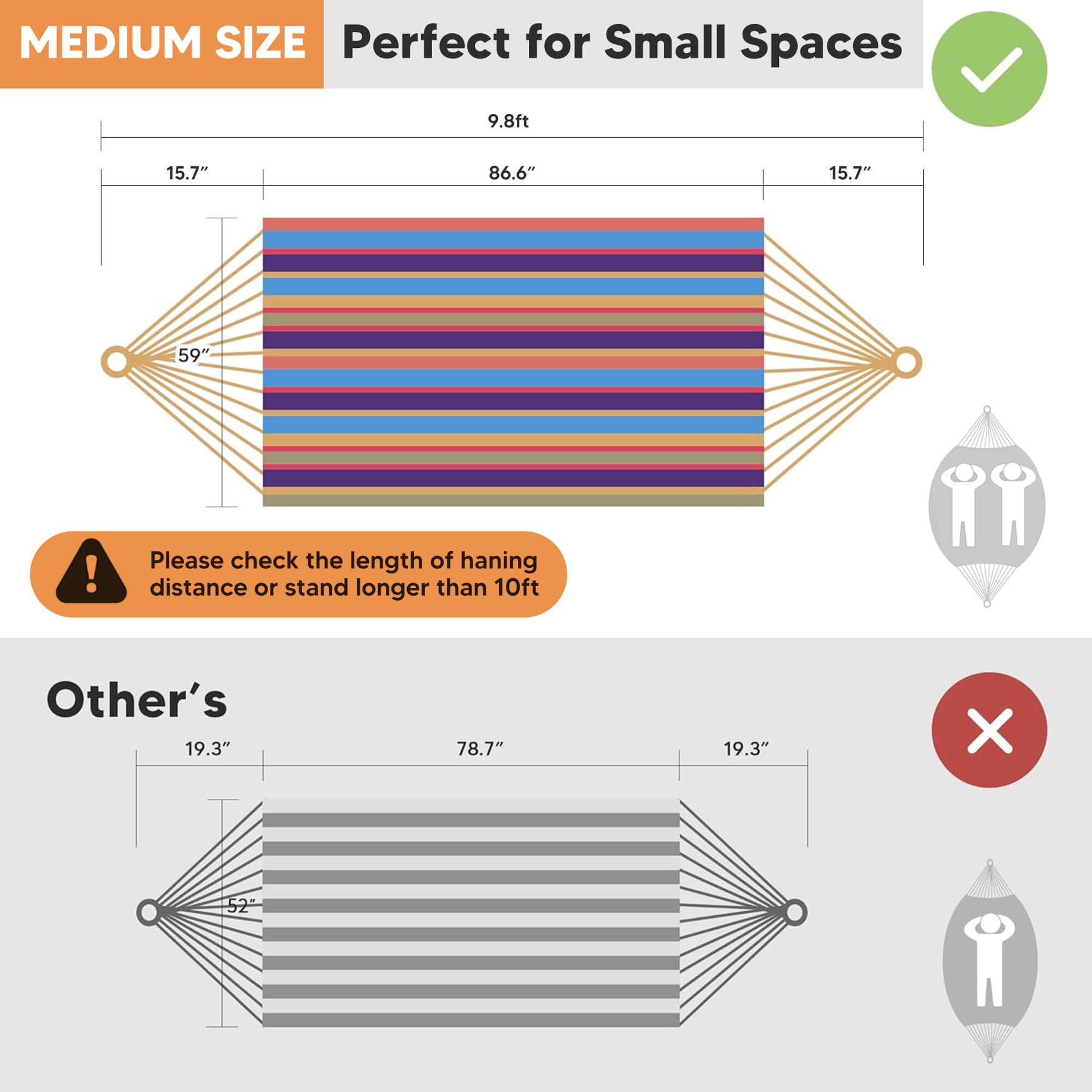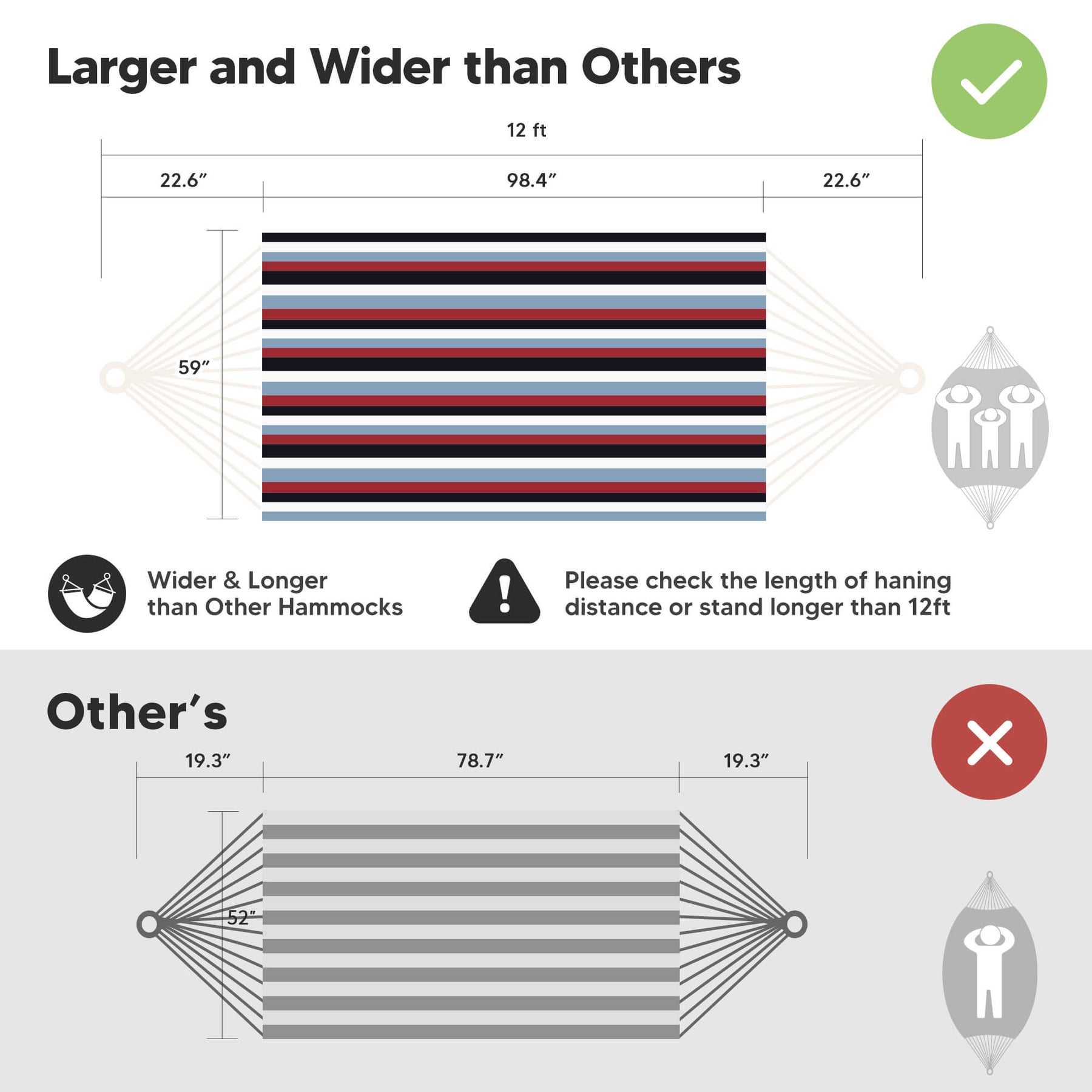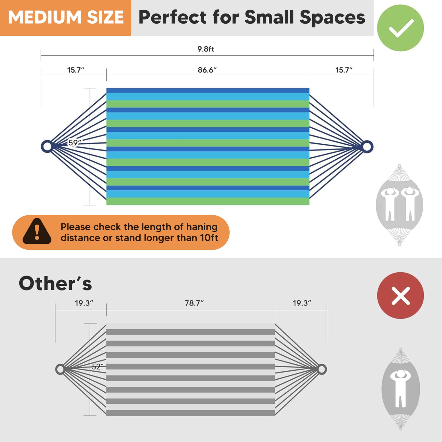 • Extra-Large Capacity: Large hammock size: 98"L × 59" W hammock bed (144" loop-to-loop). Small hammock size: 86.6"L x 59.1"W. The portable hammock is perfect for couples and shared relaxation.