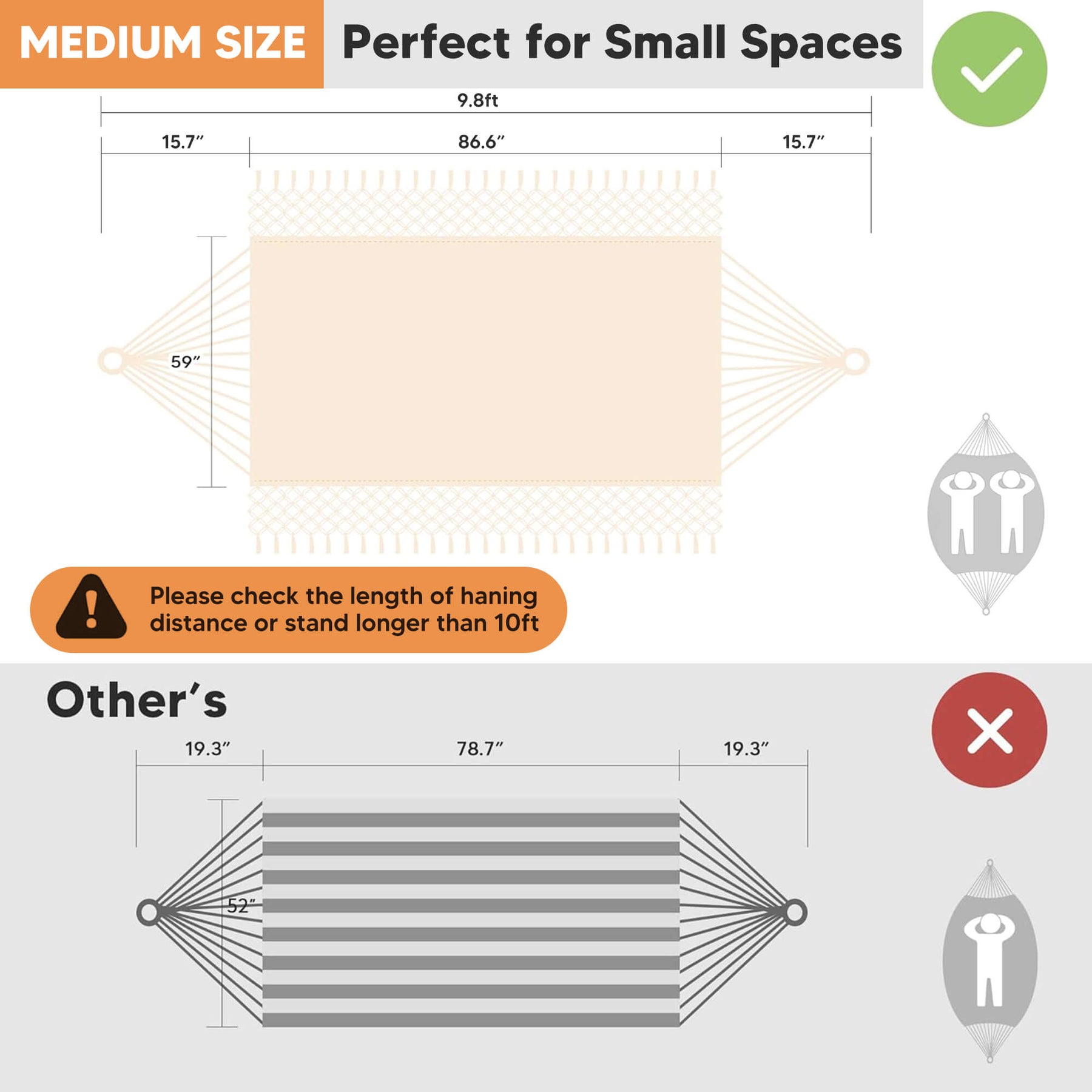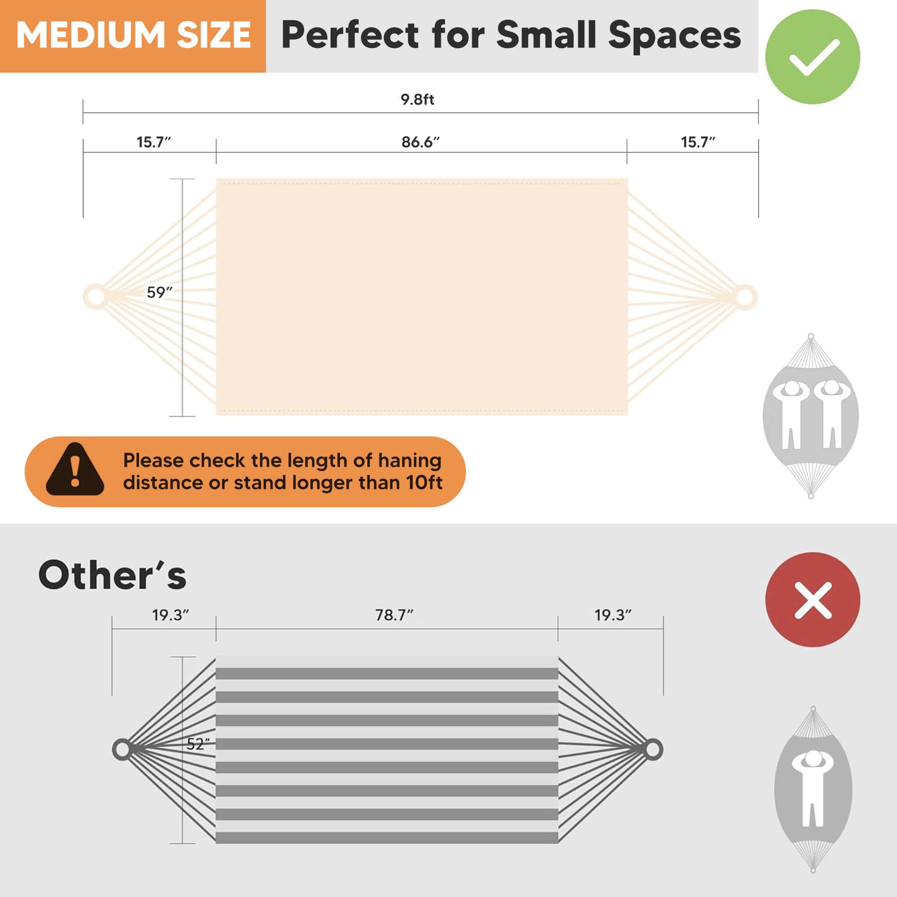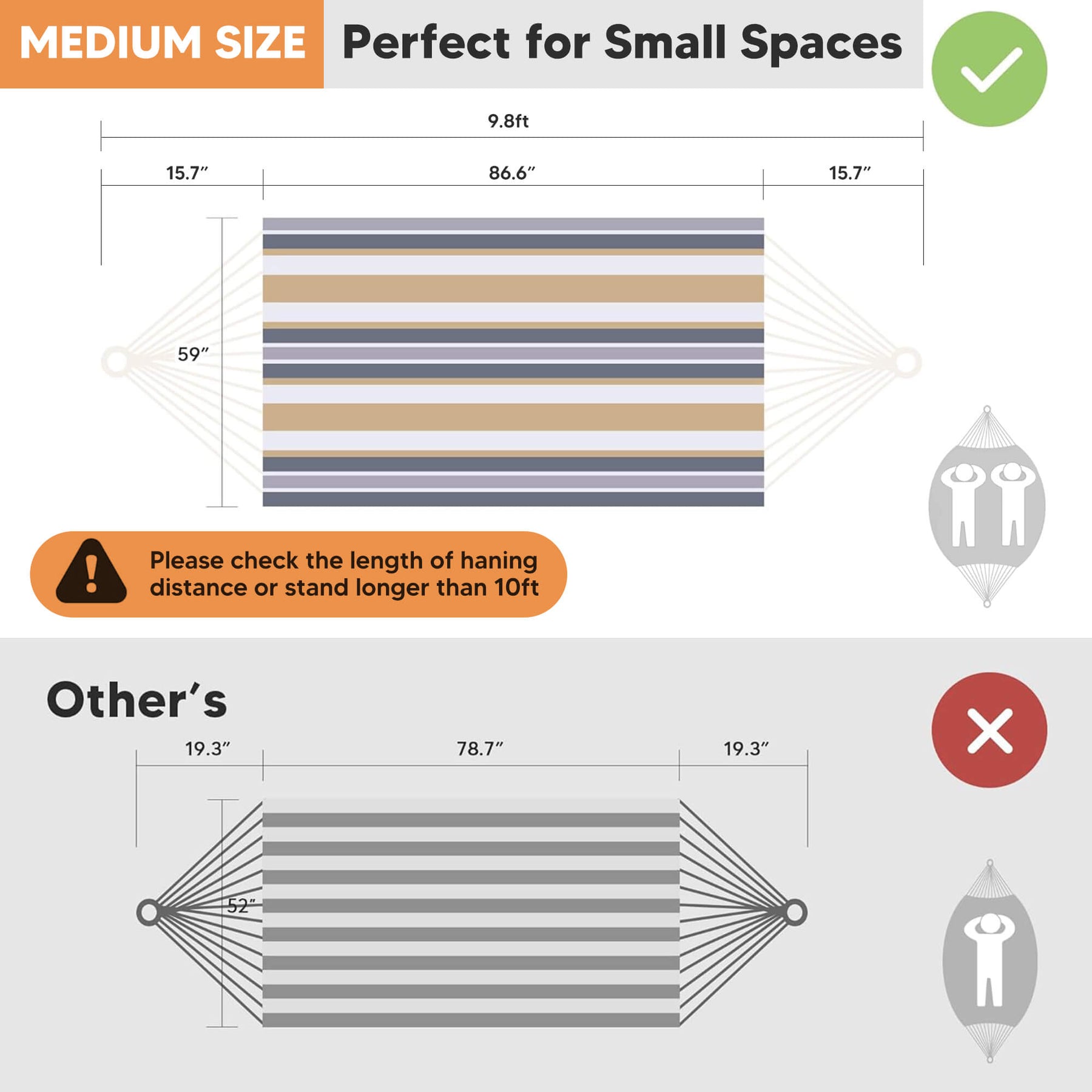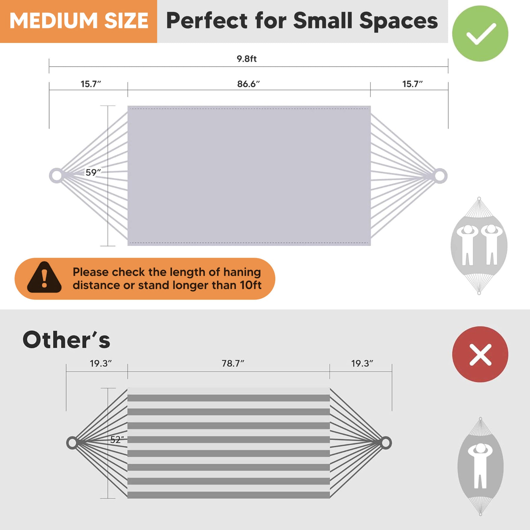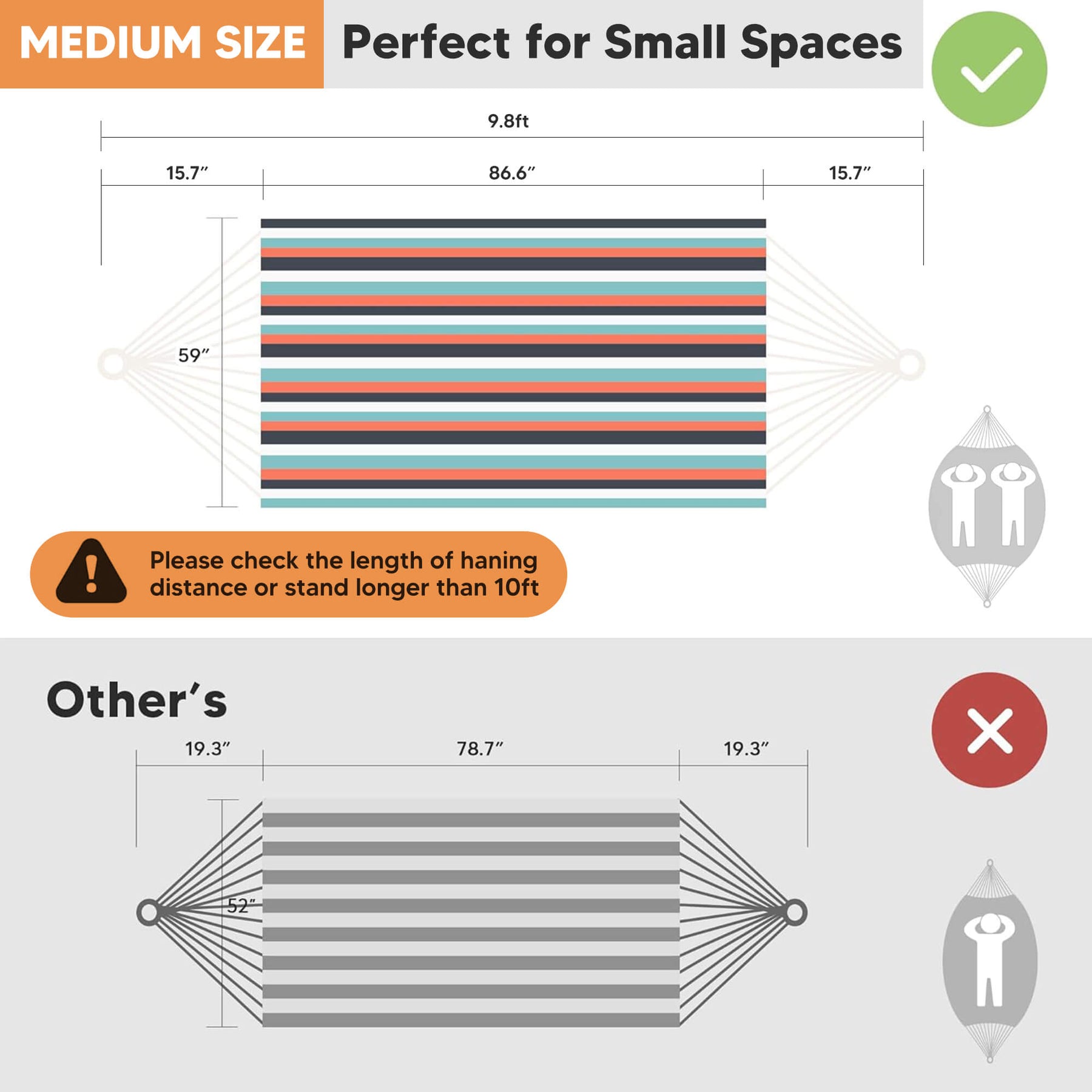 • Extra-Large Capacity: Large hammock size: 98"L × 59" W hammock bed (144" loop-to-loop). Small hammock size: 86.6"L x 59.1"W. The portable hammock is perfect for couples and shared relaxation.