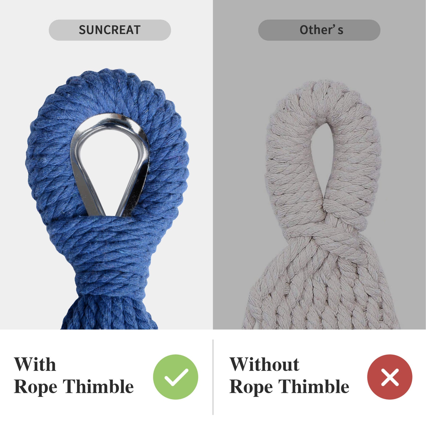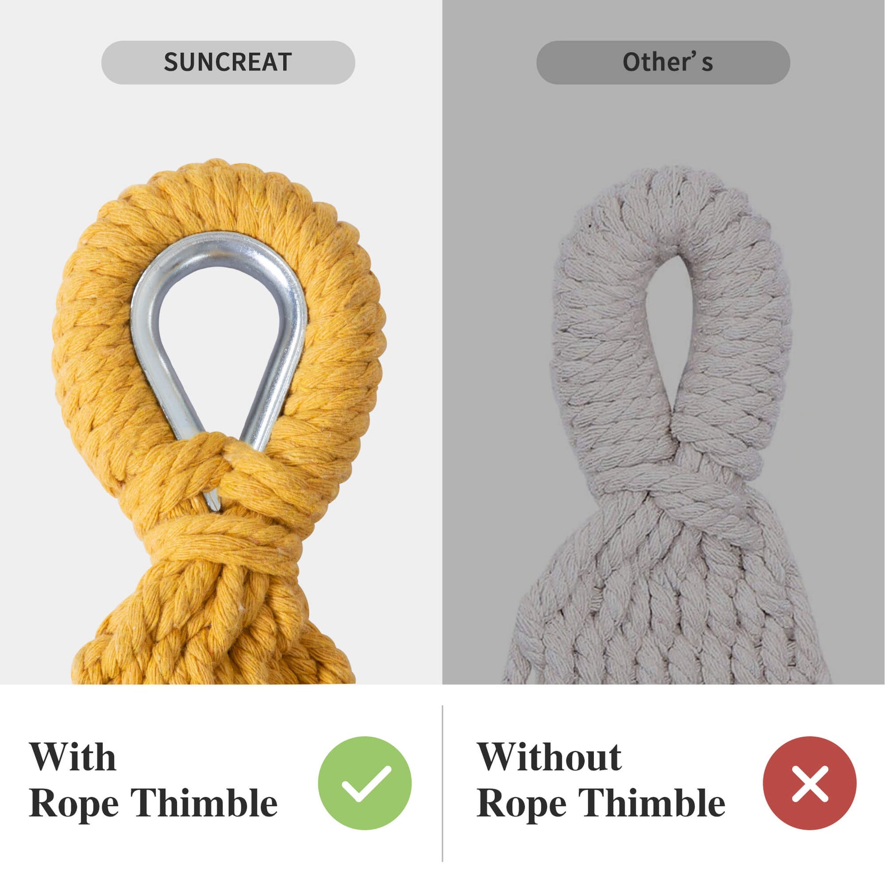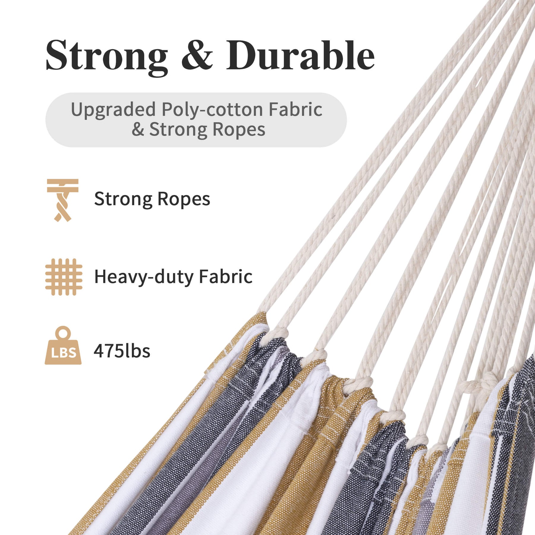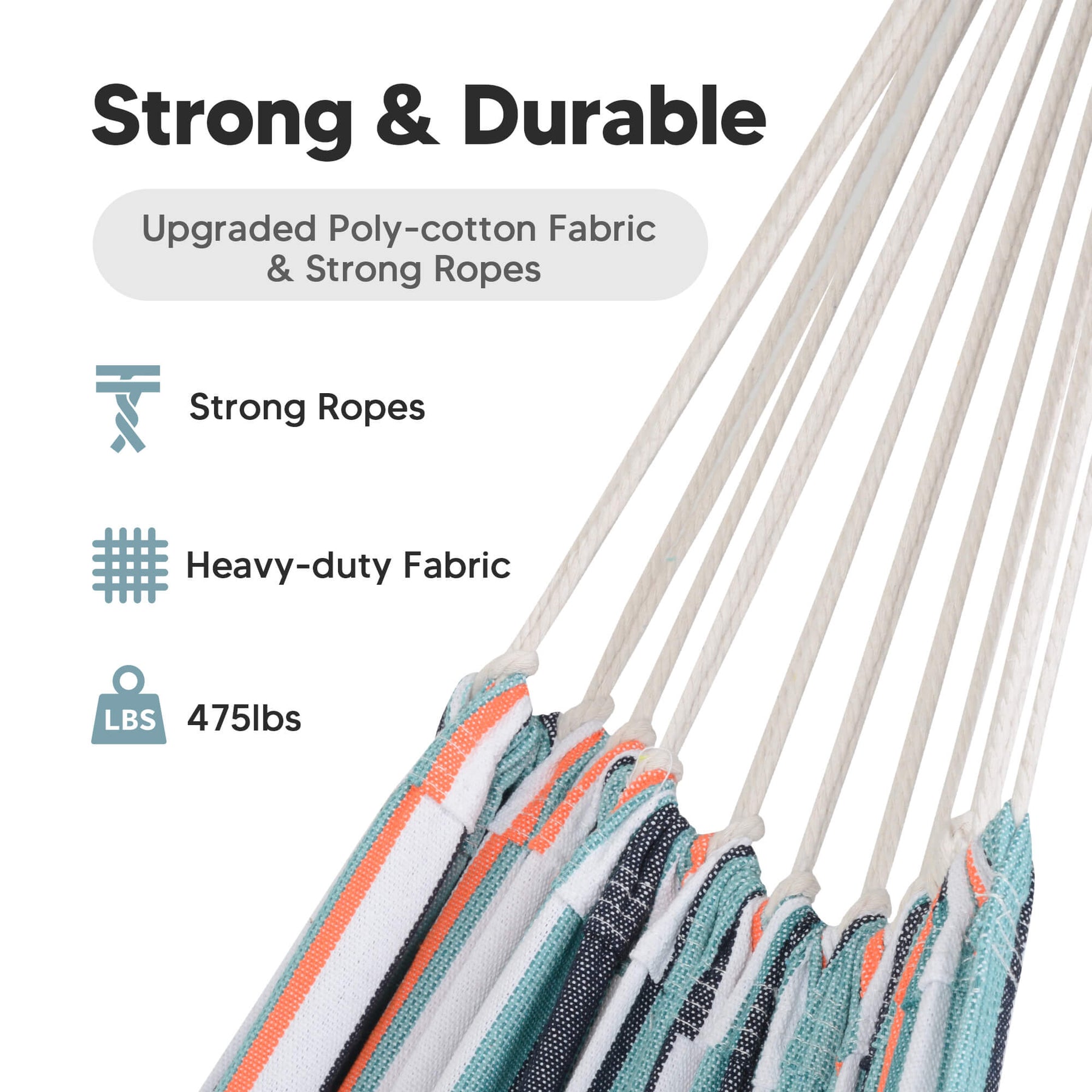 • Reinforced Rope System: Metal thimbles prevent strap friction and extend lifespan. The outdoor fabric hammock has 18 poly-cotton ropes tightly braided for maximum load capacity.