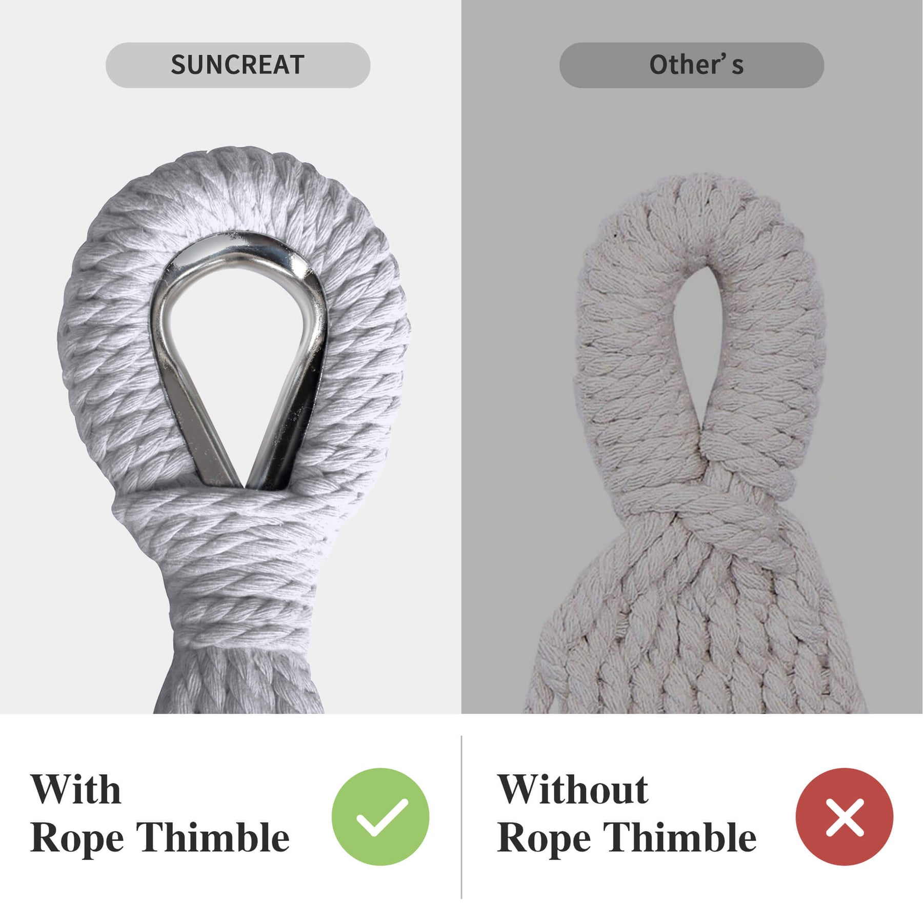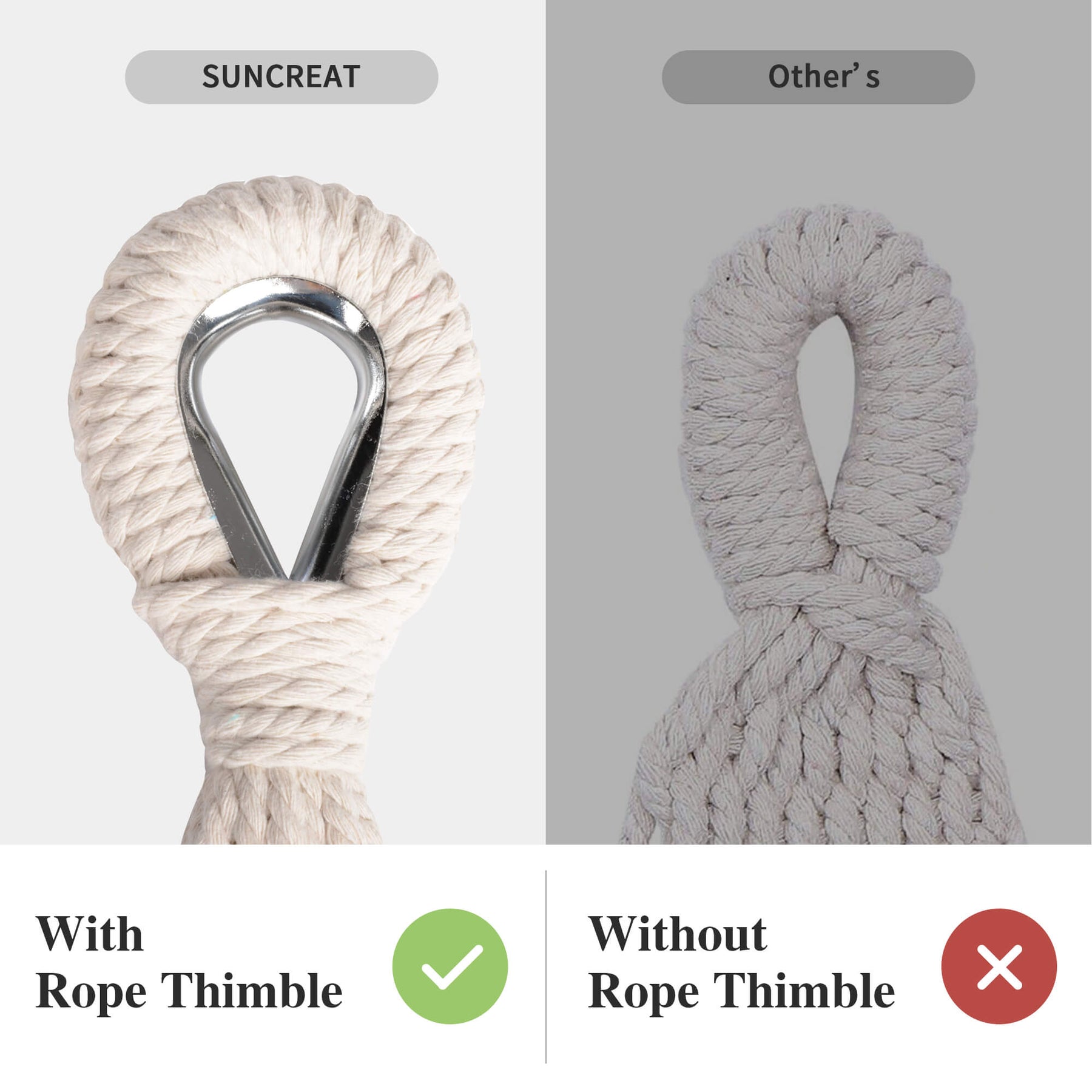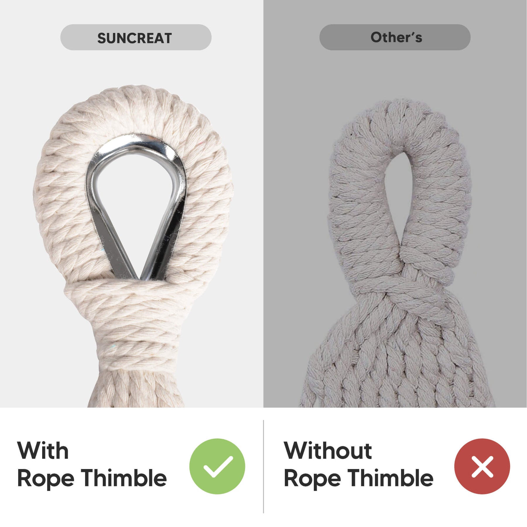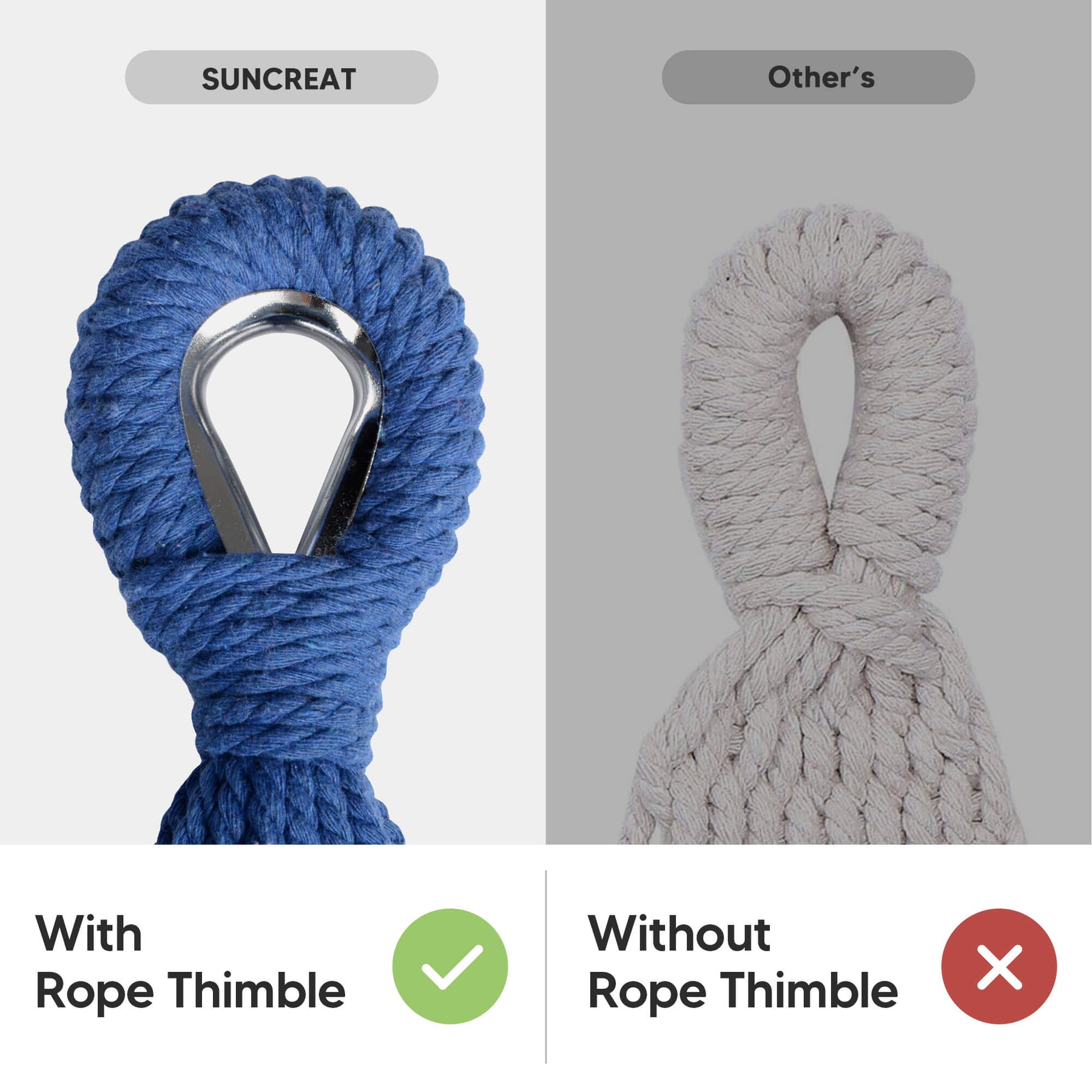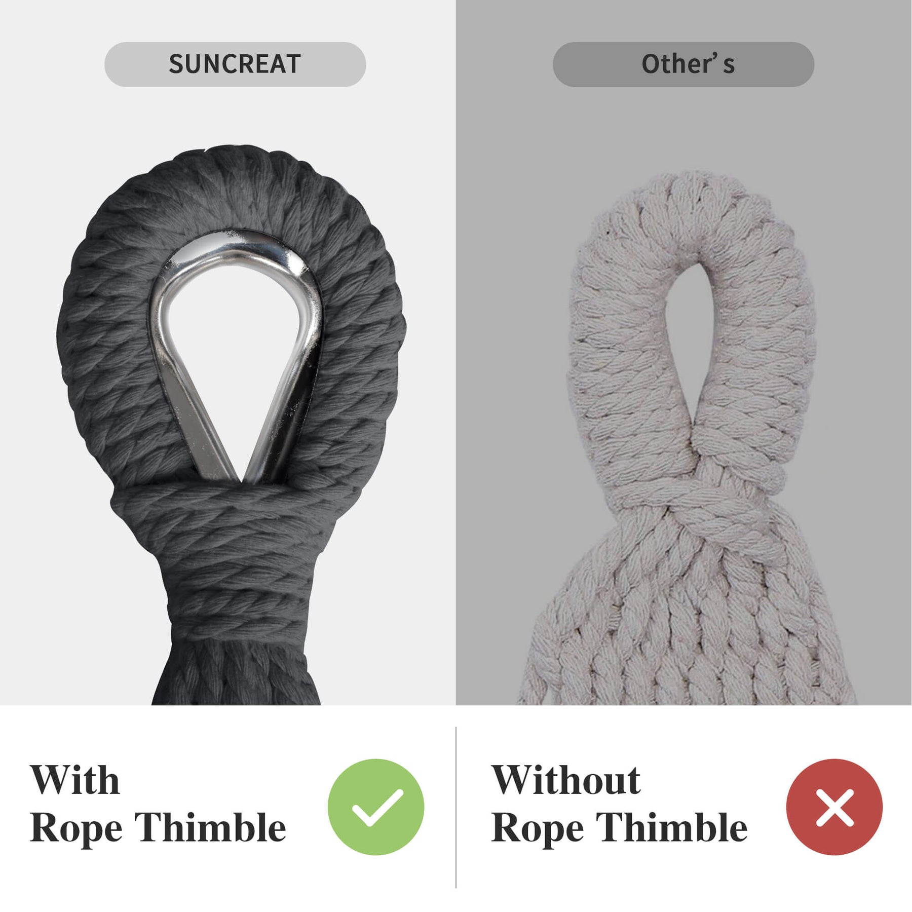 • Reinforced Rope System: Metal thimbles prevent strap friction and extend lifespan. The outdoor fabric hammock has 18 poly-cotton ropes tightly braided for maximum load capacity.