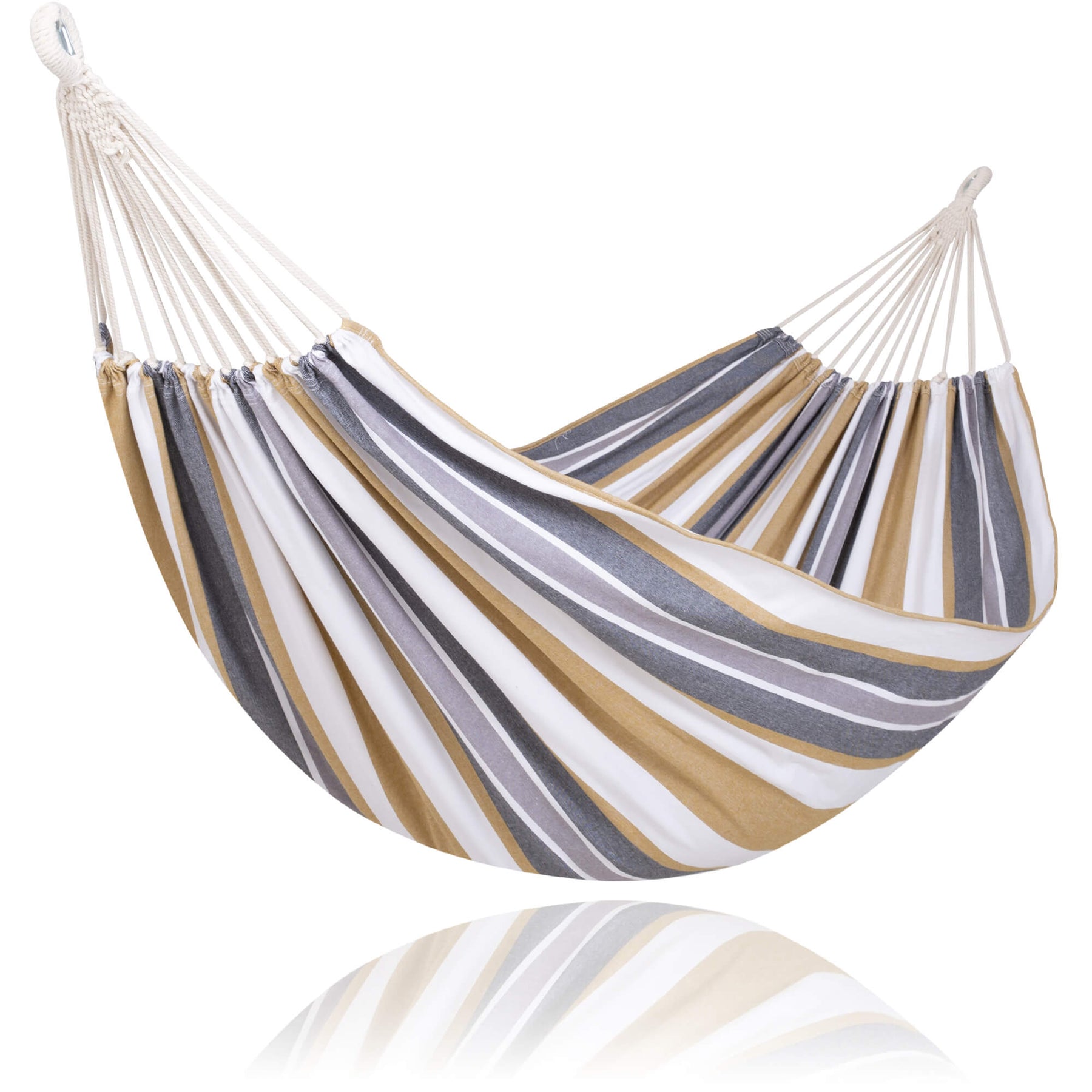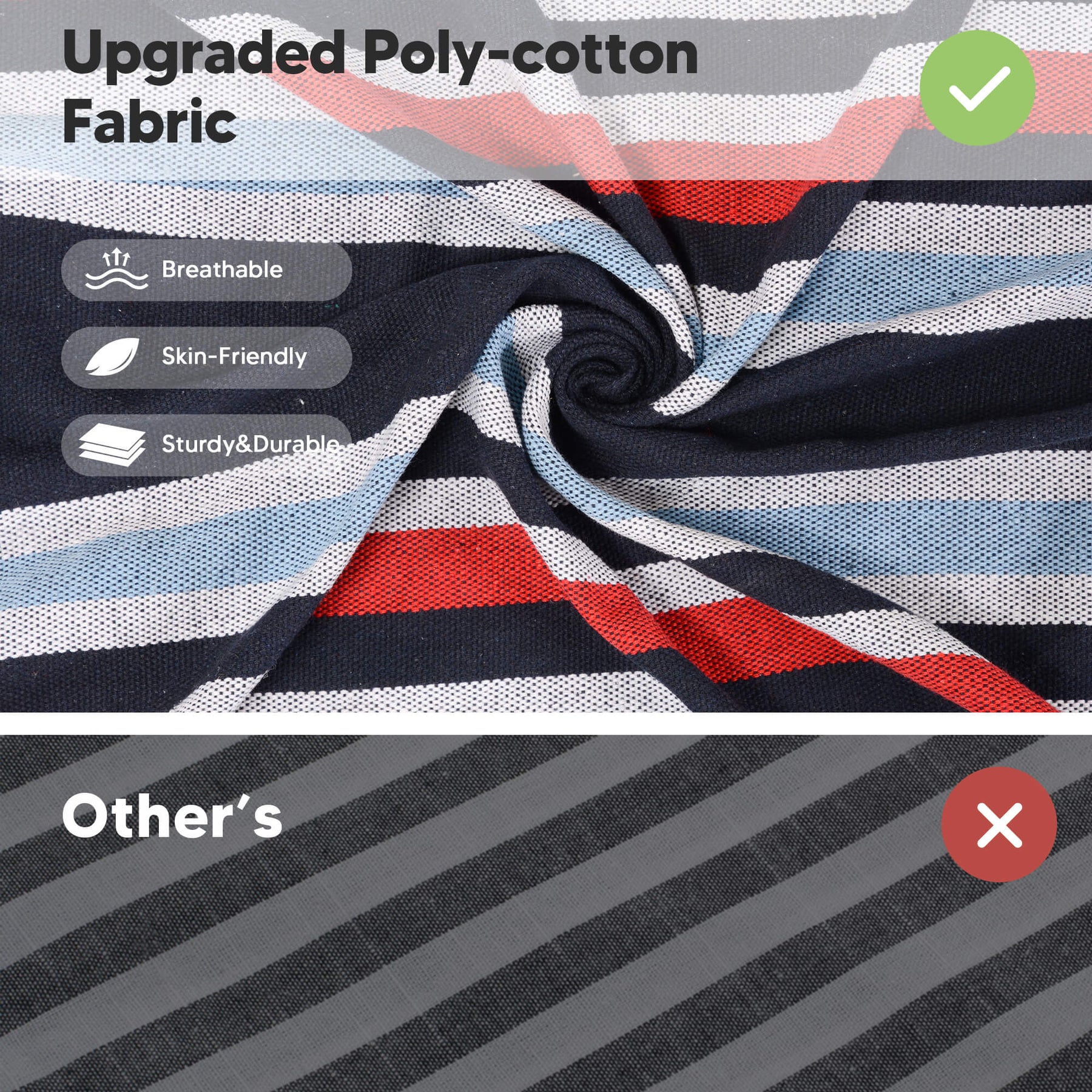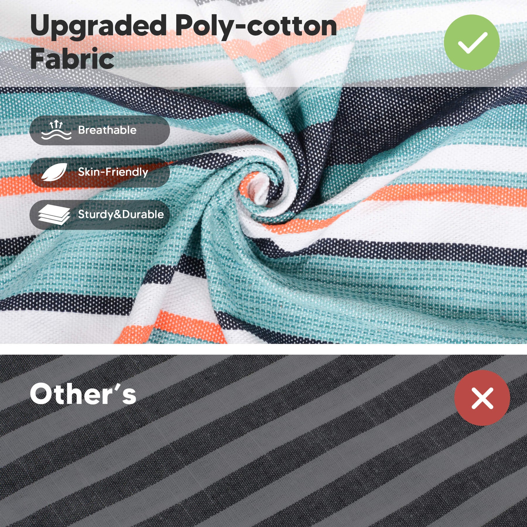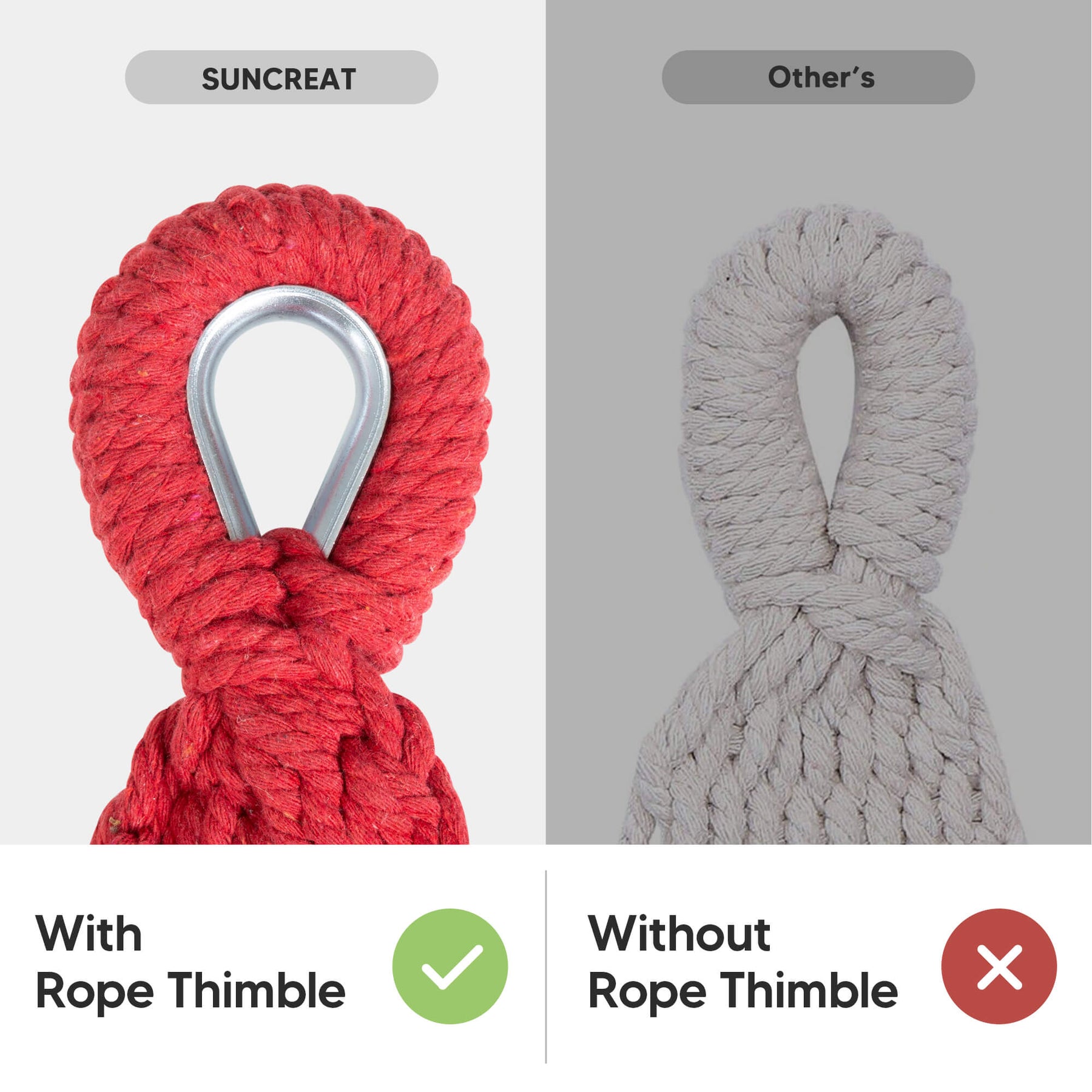 • Reinforced Rope System: Metal thimbles prevent strap friction and extend lifespan. The outdoor fabric hammock has 18 poly-cotton ropes tightly braided for maximum load capacity.