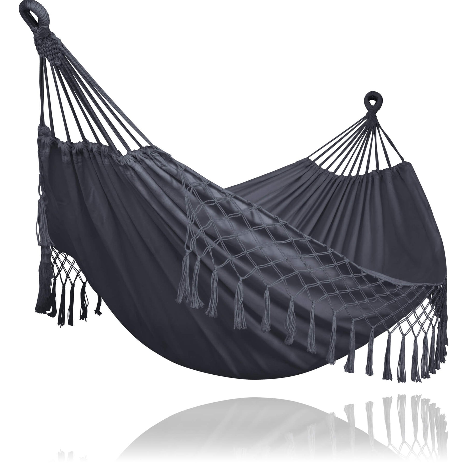 • Material: Poly-cotton, Steel • Maximum Weight Capacity: 475 lbs • Product Dimensions: X-Large: 98.4" x 59" (L x W) Medium: 118.1"L x 59.1"W • Hammock Size: X-Large: 98" x 59" (L x W) Medium: 86.6" x 59”(L x W) • Item Weight: 3.69 Pounds • Seating Capacity: 2