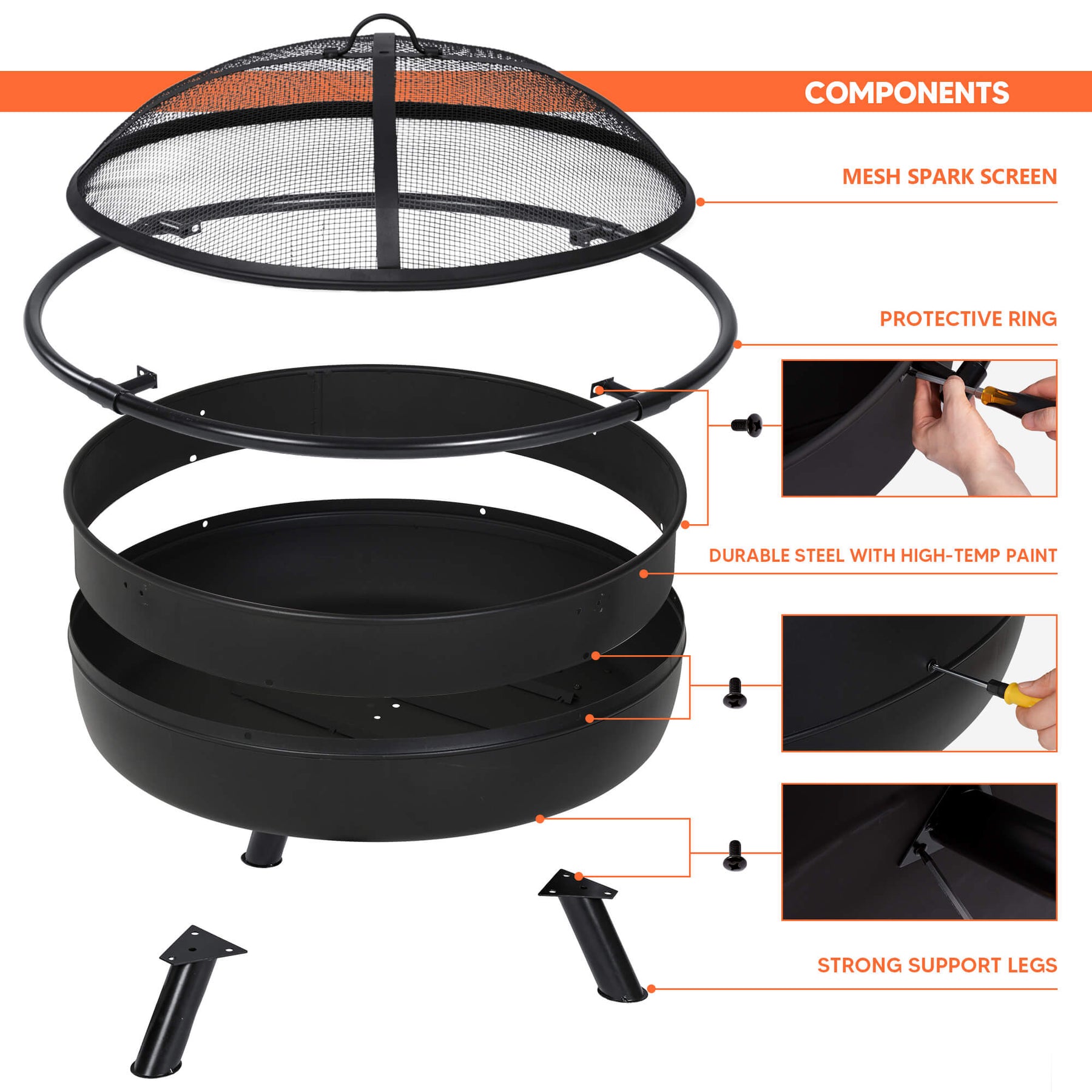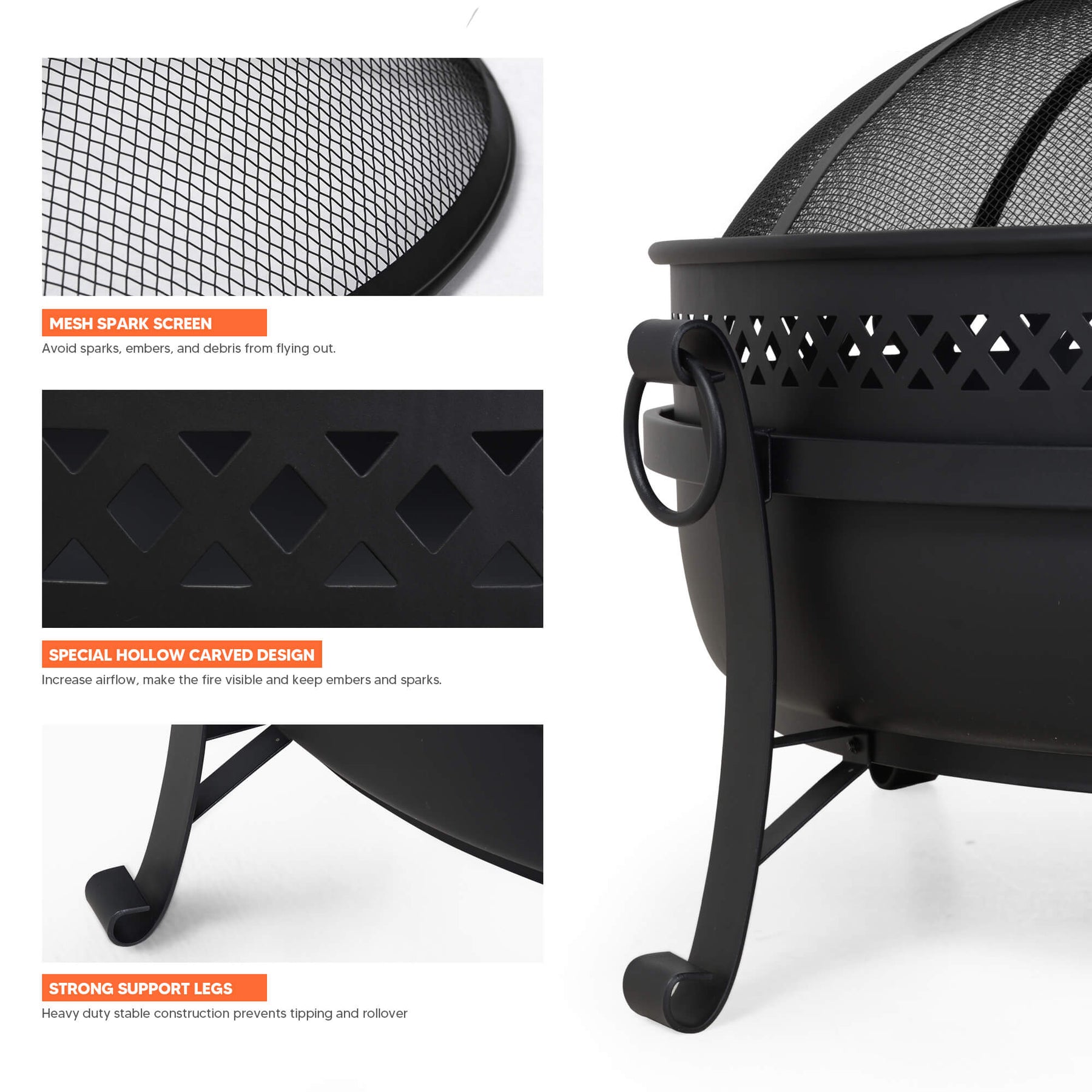 • Safety Protection: Mesh spark screen prevents embers from escaping. The wood fire pit includes a fire poker for log adjustment and a protective ring for safe distance maintenance.