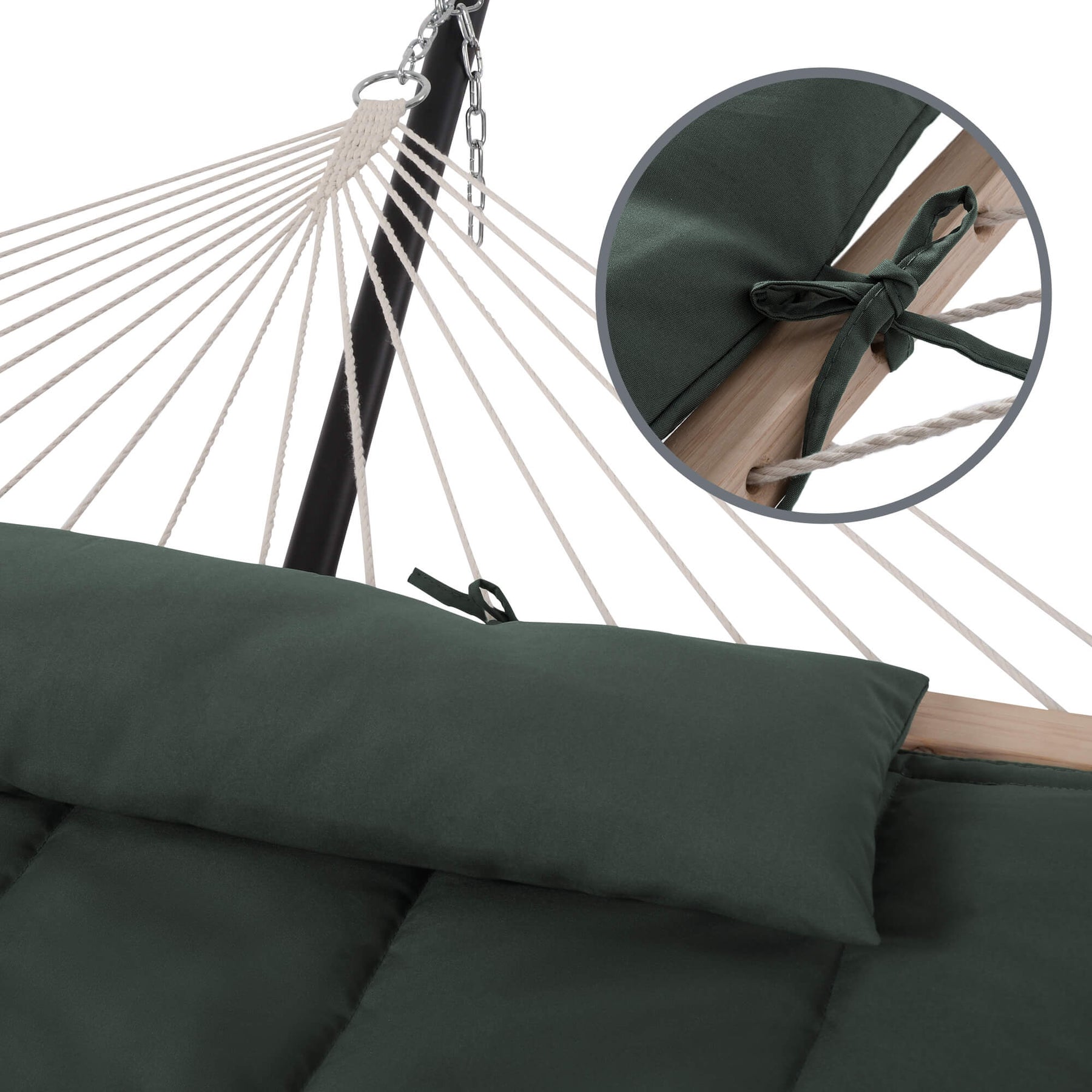 There is a chain on each side of the hammock. If the hammock is too loose or too tight, it can be adjusted by changing the hooking chain section.