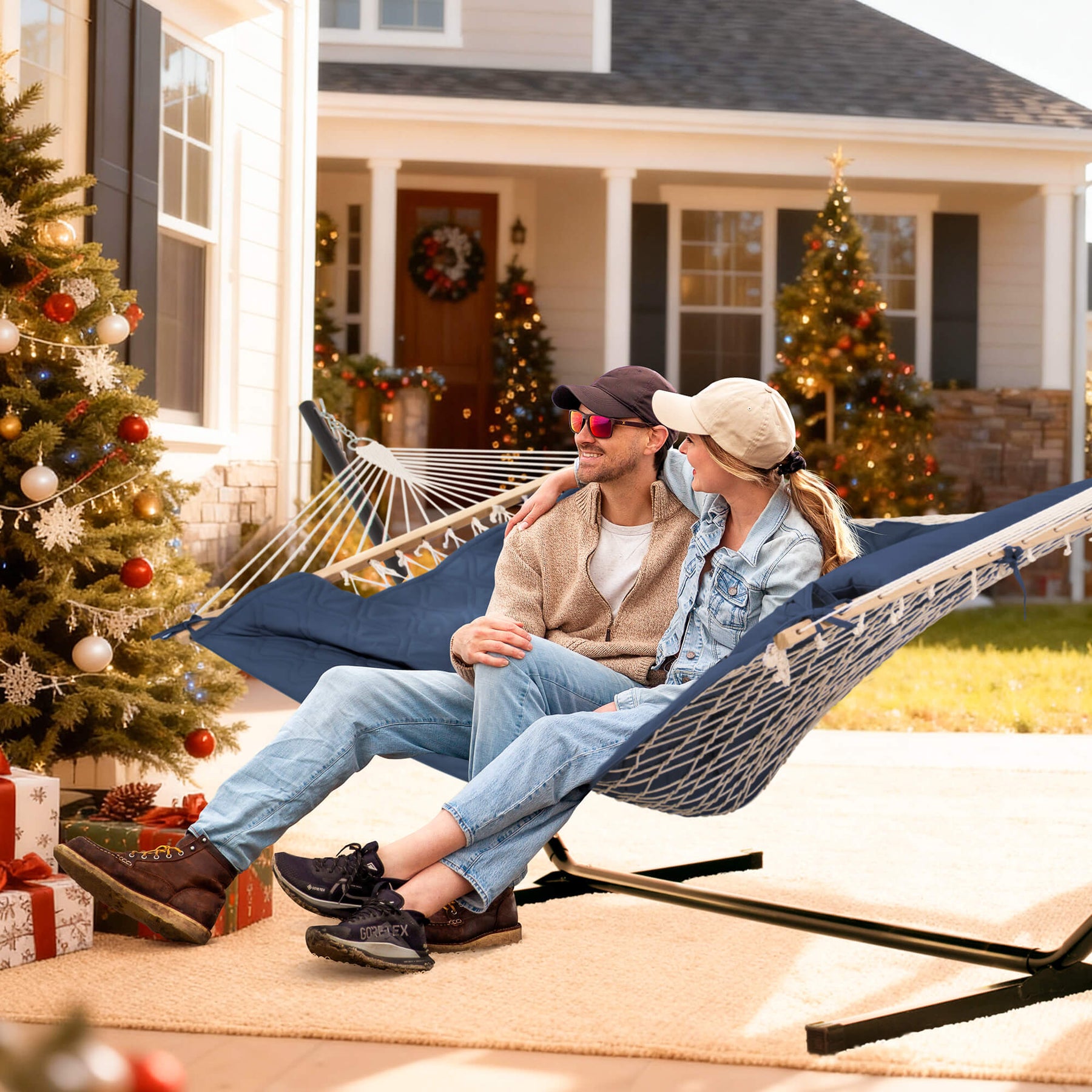 • Reversible Quilted Polyester Pad: The outdoor hammock features 2-layer quilted polyester fabric with poly fiber filling for superior comfort. Detachable for easy cleaning, fade-resistant during long-term use, and includes a polyethylene-stuffed head pillow. Reinforced ties secure the pad in place.