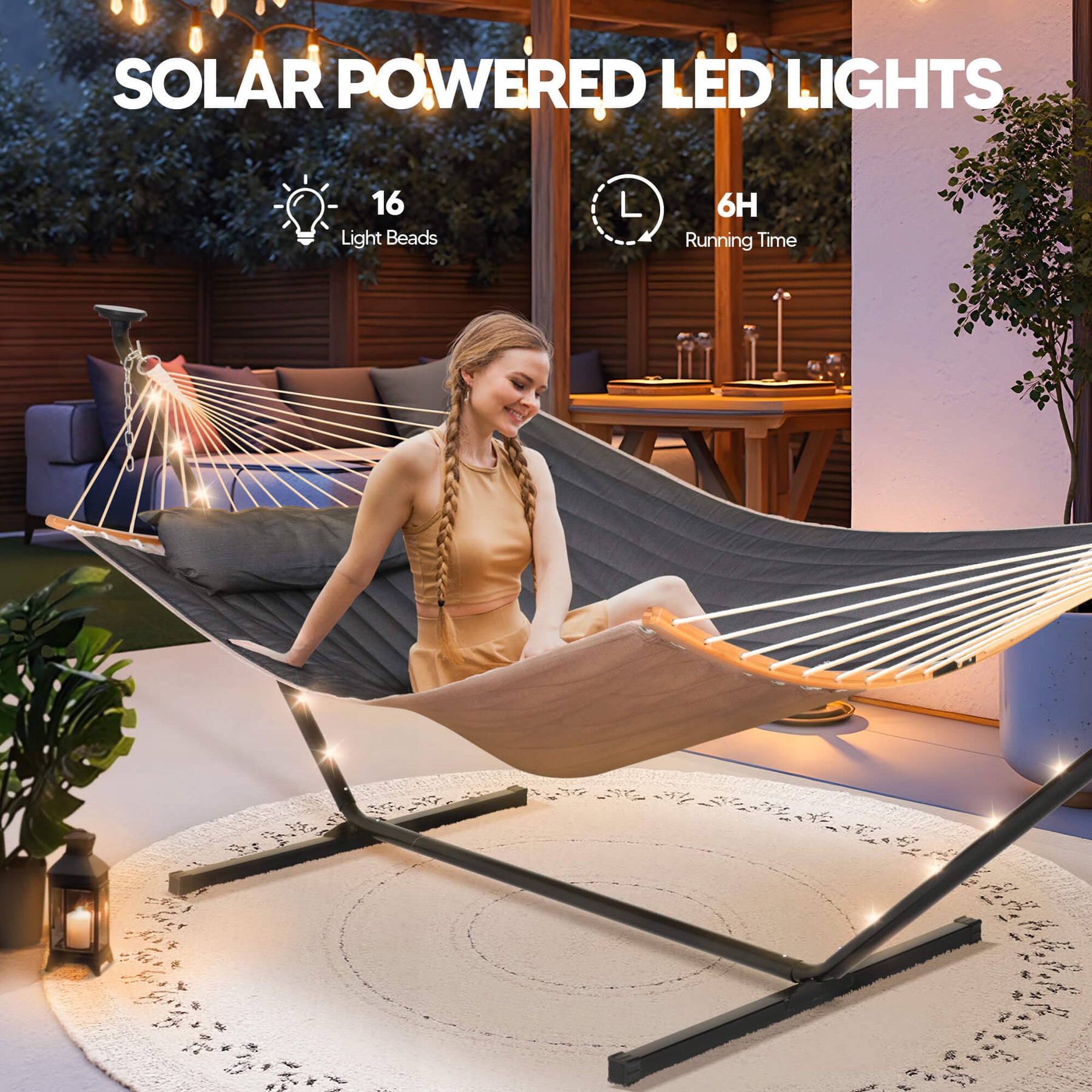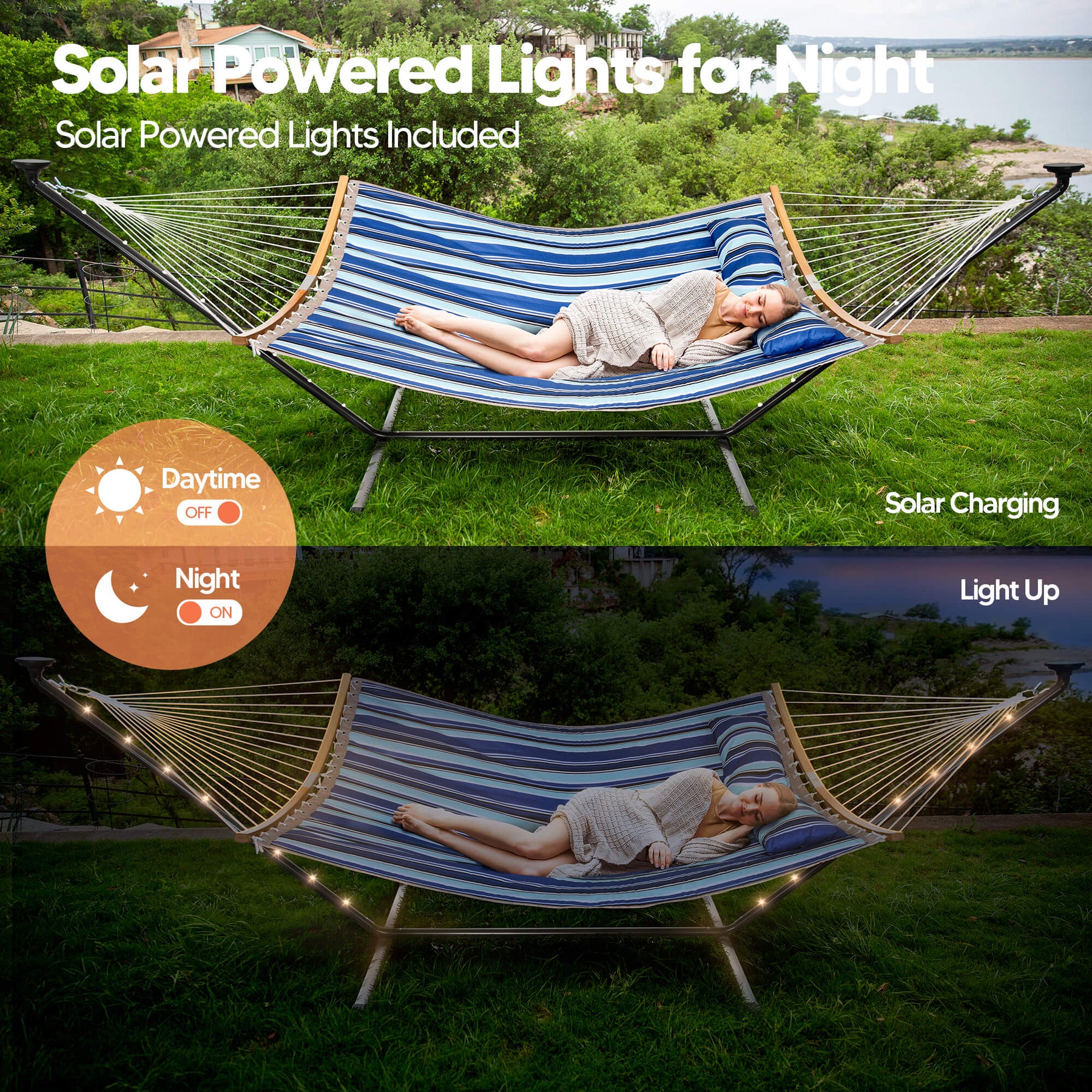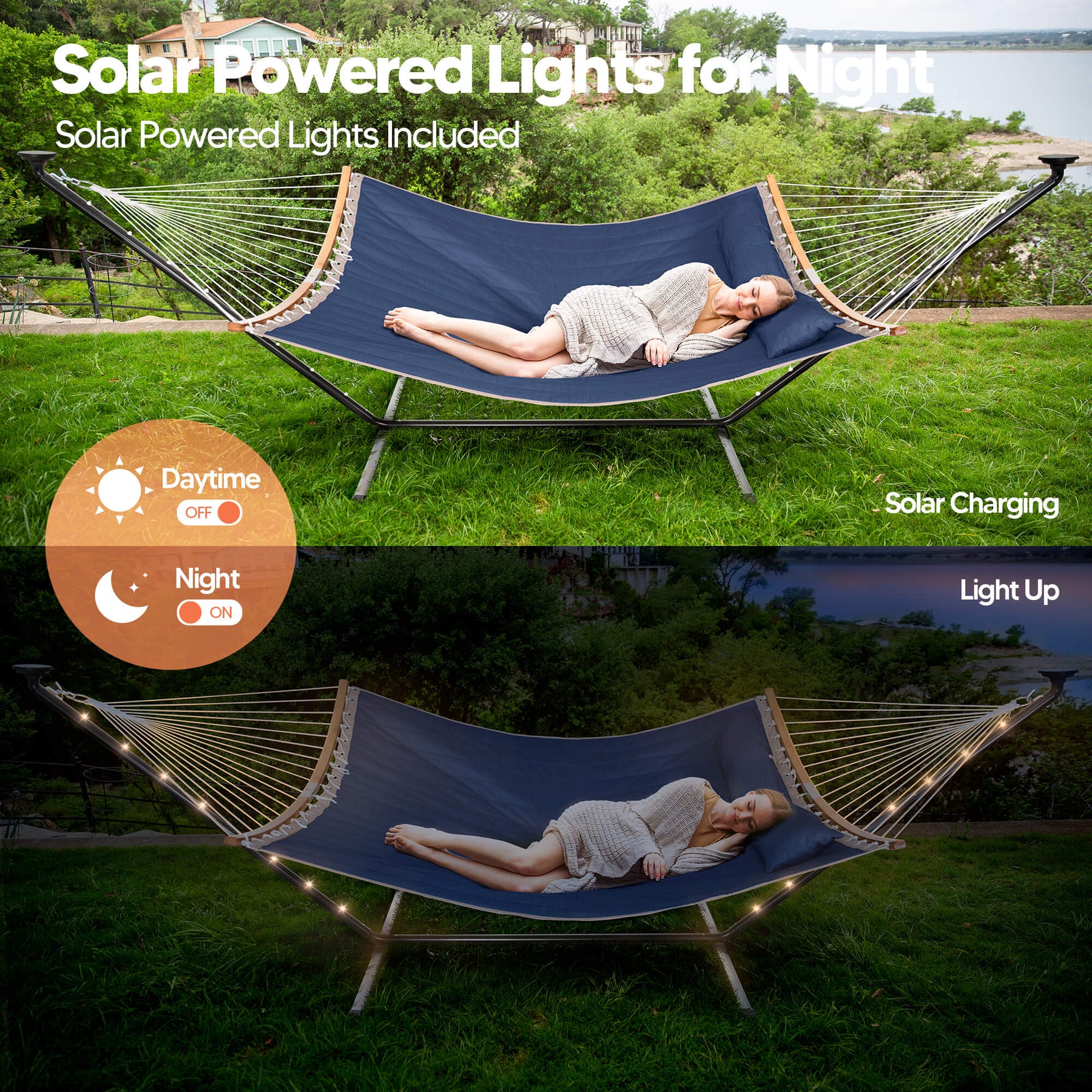 The 2 person hammock is produced with the proper weight for easy moving, and the overall design is to allow customers to lie comfortably on it. If you encounter strong winds, it is recommended to put the hammock in.