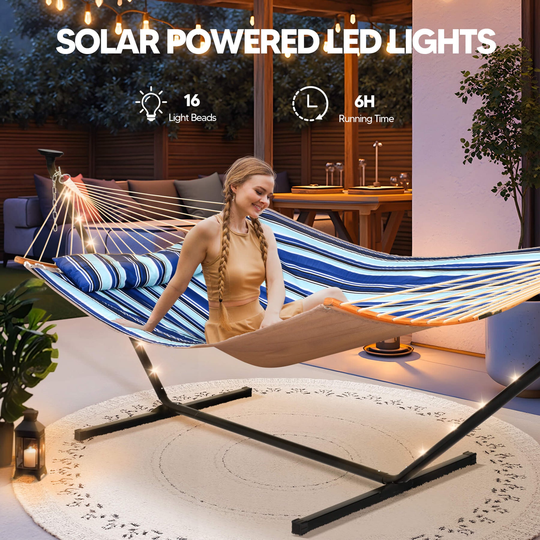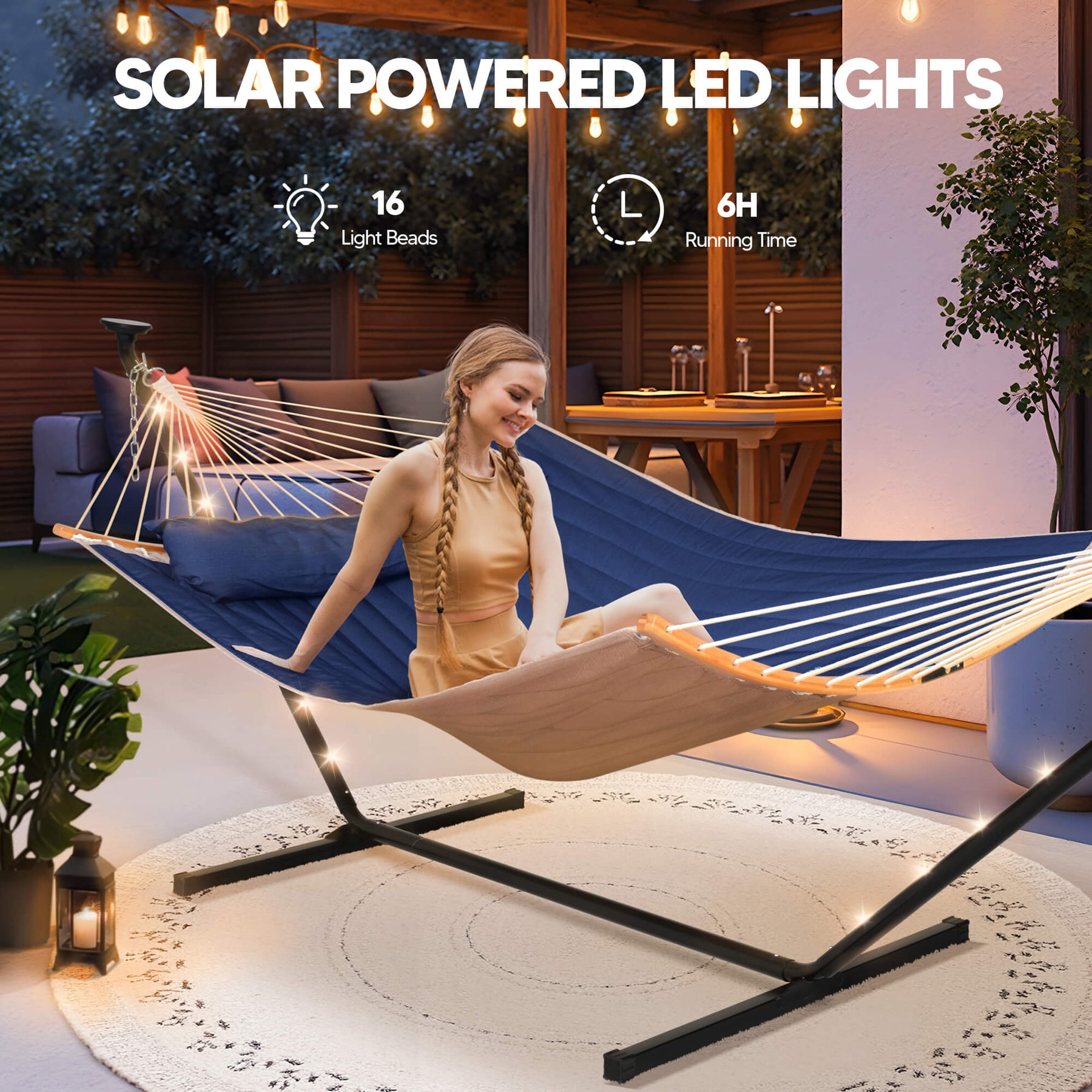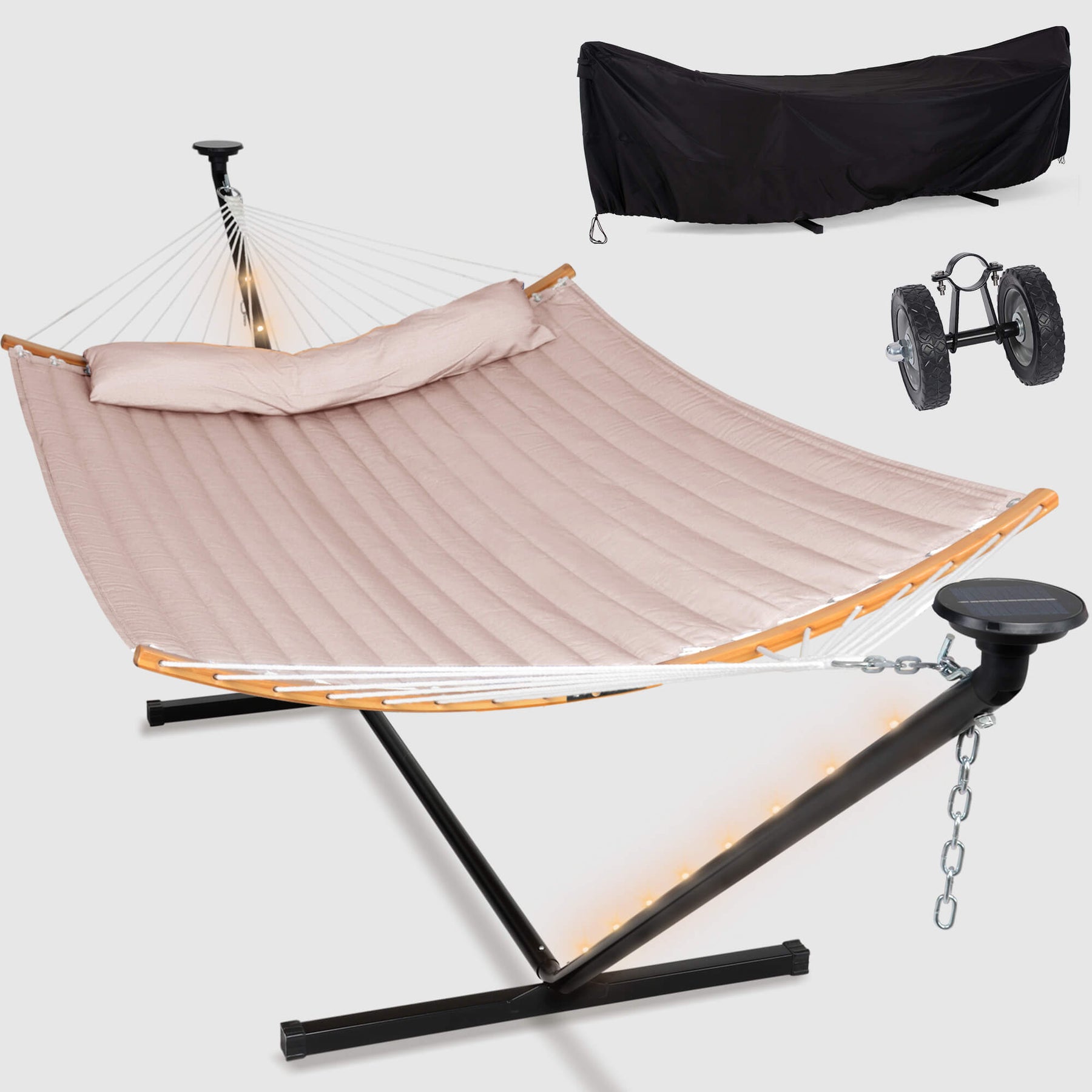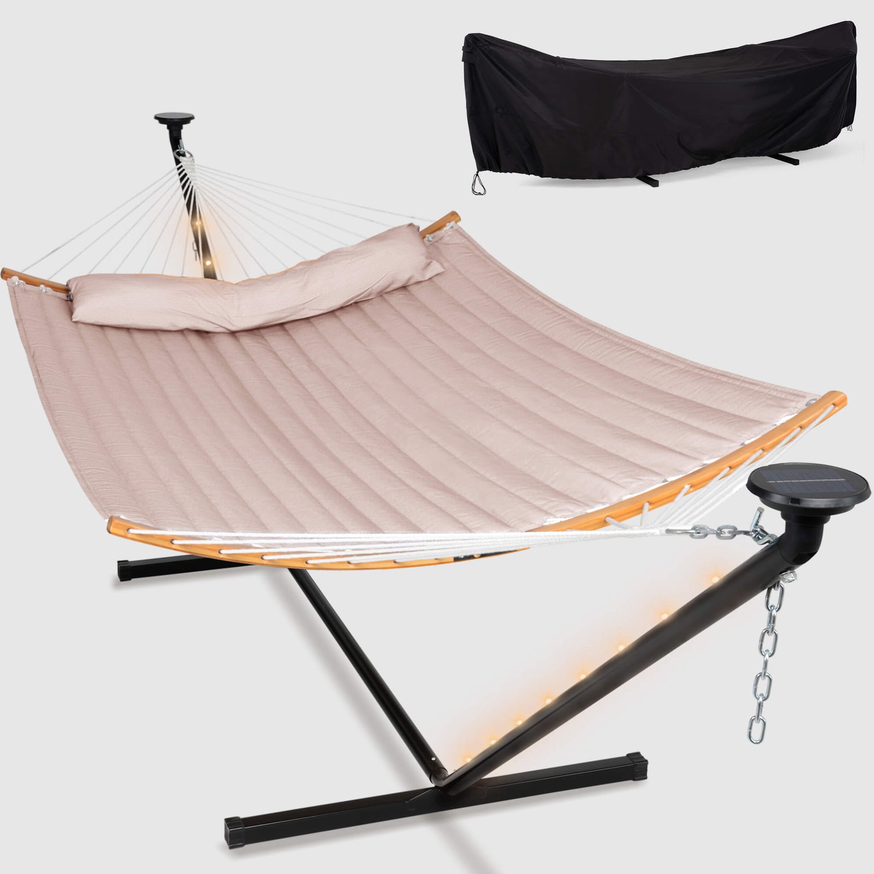 The 2 person hammock is produced with the proper weight for easy moving, and the overall design is to allow customers to lie comfortably on it. If you encounter strong winds, it is recommended to put the hammock in.