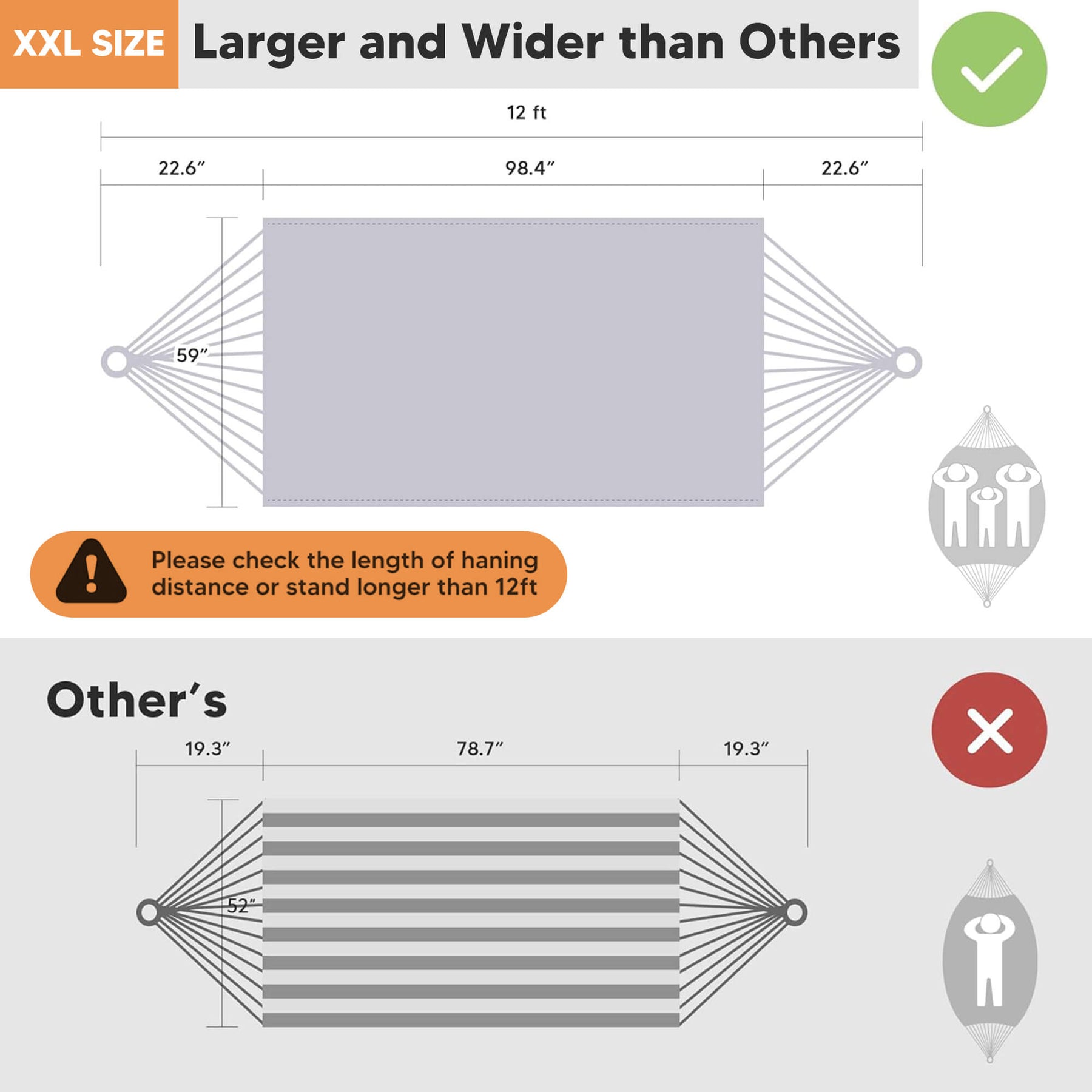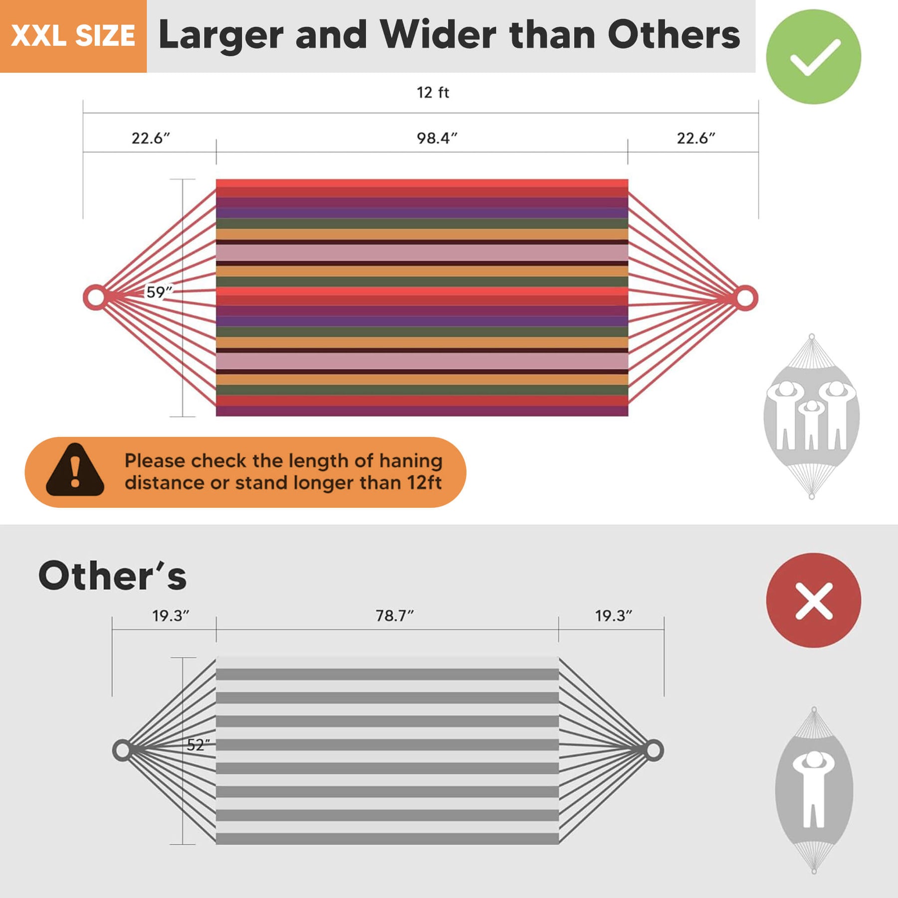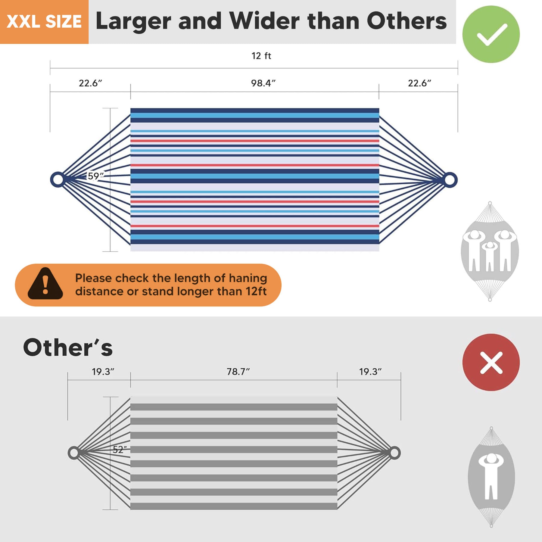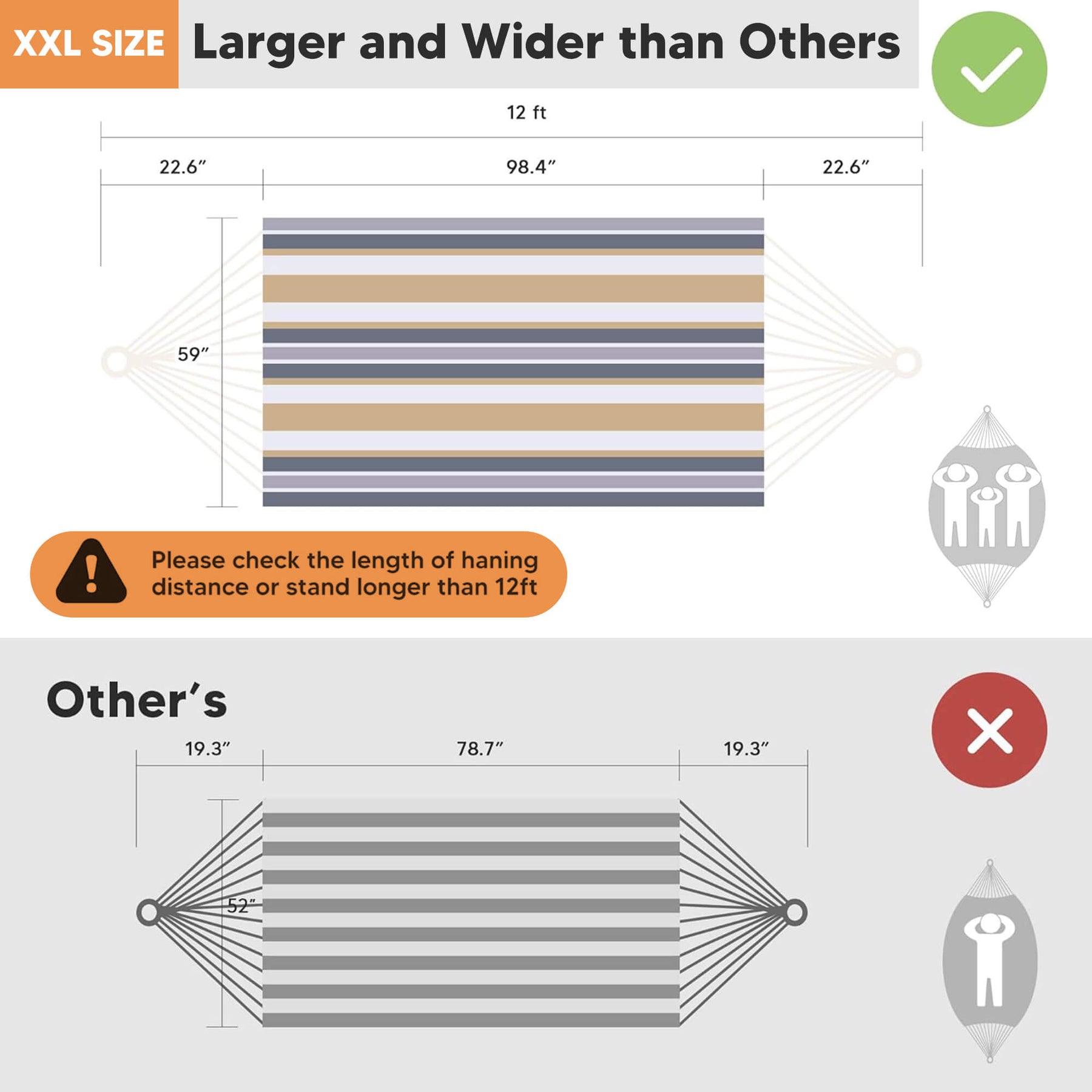 • Extra-Large Capacity: 98"L × 59"W hammock bed (144" loop-to-loop). The portable hammock is perfect for couples and shared relaxation.