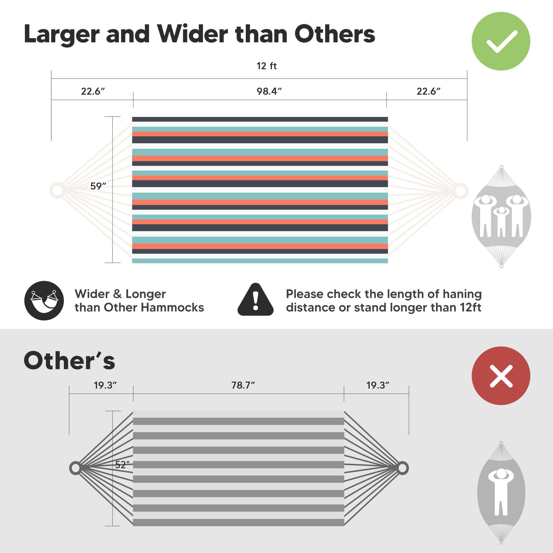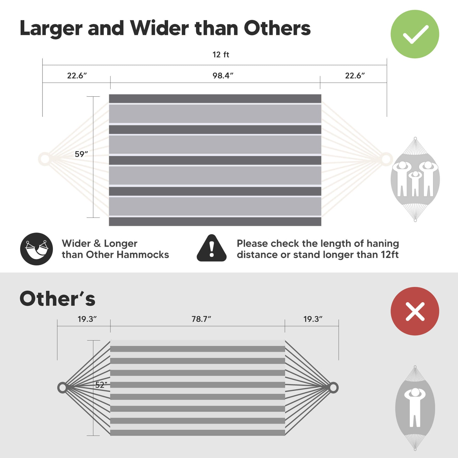 • Extra-Large Capacity: 98"L × 59"W hammock bed (144" loop-to-loop). The portable hammock is perfect for couples and shared relaxation.