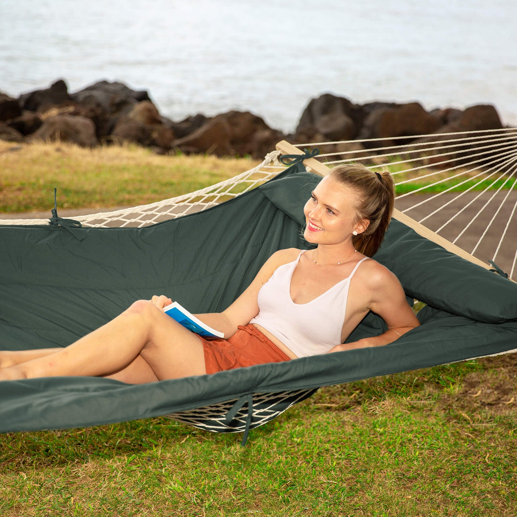• Reversible Quilted Pad: The cotton rope hammock has a 2-layer quilted polyester with poly fiber filling. Fade-resistant for long-term use. Includes polyethylene head pillow and reinforced ties for secure placement.